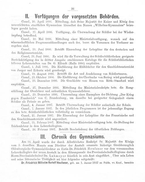 Cassel, 10. April 1886. Mitteilung, daſs Seine Majestät der Kaiser und König dem neuerrichteten staatlichen Gymnasium hierselbst den Namen„Wilhelms-Gymnasium“ beizu- legen geruht haben.
