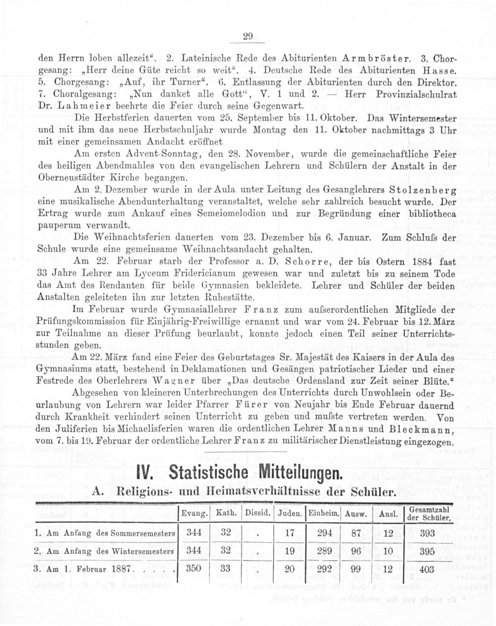 Am 22. Februar starb der Professor a. D. Schorre, der bis Ostern 1884 fast 33 Jahre Lehrer am Lyceum Fridericianum gewesen war und zuletzt bis zu seinem Tode das Amt des Rendanten für beide Gymnasien bekleidete. Lehrer und Schüler der beiden Anstalten geleiteten ihn zur letzten Ruhestätte.