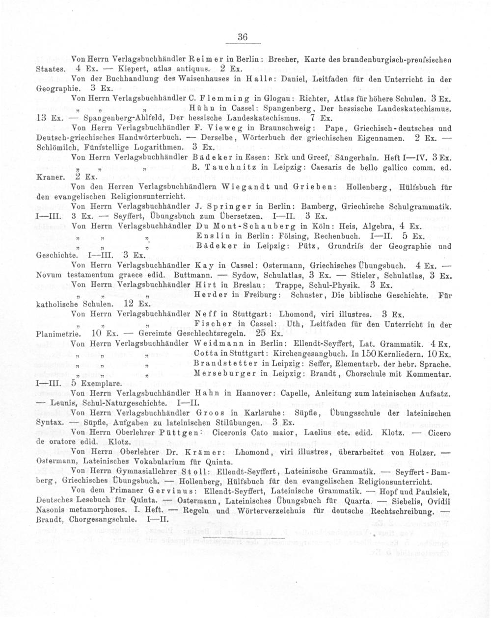 Von dem Primaner Gervinus: Ellendt-Seyffert, Lateinische Grammatik.— Hopf und Paulsiek, Deutsches Lesebuch für Quinta.— Ostermann, Lateinisches UÜbungsbuch für Quarta.— Siebelis, Ovidii