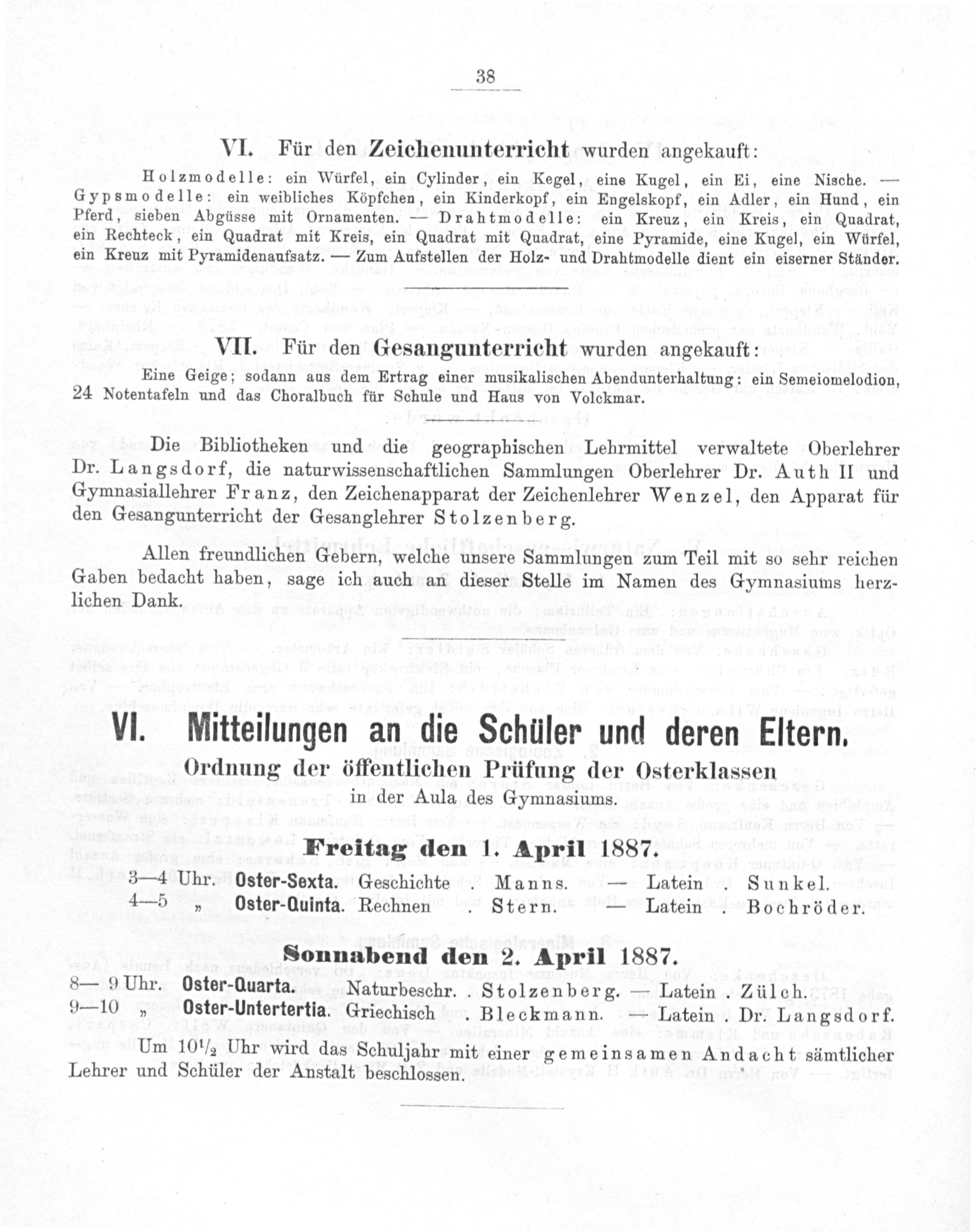 Die Bibliotheken und die geographischen Lehrmittel verwaltete Oberlehrer Dr. Langsdorf, die naturwissenschaftlichen Sammlungen Oberlehrer Dr. Auth II und Gymnasiallehrer Franz, den Zeichenapparat der Zeichenlehrer Wenzel, den Apparat für den Gesangunterricht der Gesanglehrer Stolzenber g.
