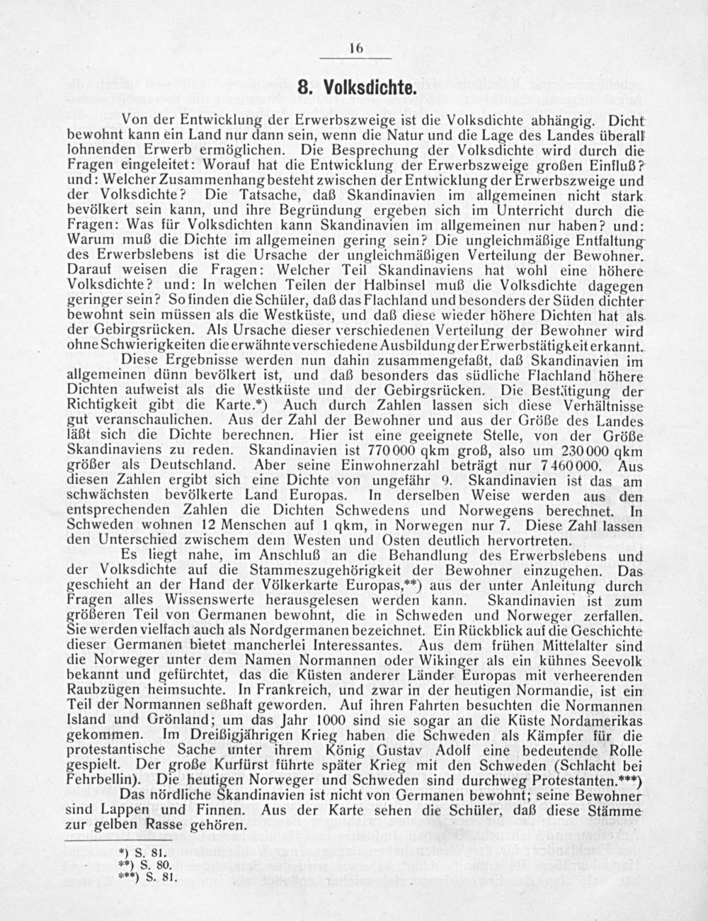 Von der Entwicklung der Erwerbszweige ist die Volksdichte abhängig. Dicht bewohnt kann ein Land nur dann sein, wenn die Natur und die Lage des Landes überall lohnenden Erwerb ermöglichen. Die Besprechung der Volksdichte wird durch die Fragen eingeleitet: Worauf hat die Entwicklung der Erwerbszweige großen Einfluß? und: Welcher Zusammenhang besteht zwischen der Entwicklung der Erwerbszweige und der Volksdichte? Die Tatsache, daß Skandinavien im allgemeinen nicht stark bevölkert sein kann, und ihre Begründung ergeben sich im Unterricht durch die Fragen: Was für Volksdichten kann Skandinavien im allgemeinen nur haben? und: Warum muß die Dichte im allgemeinen gering sein? Die ungleichmäßige Entfaltung des Erwerbslebens ist die Ursache der ungleichmäßigen Verteilung der Bewohner. Darauf weisen die Fragen: Welcher Teil Skandinaviens hat wohl eine höhere Volksdichte? und: In welchen Teilen der Halbinsel muß die Volksdichte dagegen geringer sein? So finden die Schüler, daß das Flachland und besonders der Süden dichter bewohnt sein müssen als die Westküste, und daß diese wieder höhere Dichten hat als der Gebirgsrücken. Als Ursache dieser verschiedenen Verteilung der Bewohner wird ohne Schwierigkeiten die erwähnte verschiedene Ausbildung der Erwerbstätigkeit erkannt.