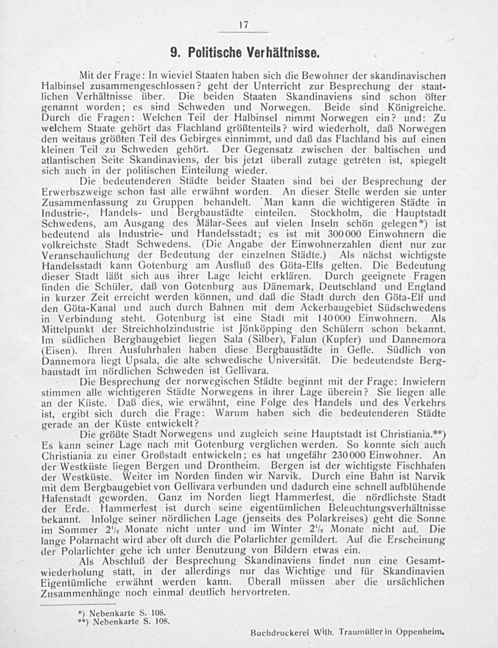 Mit der Frage: In wieviel Staaten haben sich die Bewohner der skandinavischen Halbinsel zusammengeschlossen? geht der Unterricht zur Besprechung der staat- lichen Verhältnisse über. Die beiden Staaten Skandinaviens sind schon öfter genannt worden; es sind Schweden und Norwegen. Beide sind Königreiche. Durch die Fragen: Welchen Teil der Halbinsel nimmt Norwegen ein? und: Zu welchem Staate gehört das Flachland größtenteils? wird wiederholt, daß Norwegen den weitaus größten Teil des Gebirges einnimmt, und daß das Flachland bis auf einen kleinen Teil zu Schweden gehört. Der Gegensatz zwischen der baltischen und atlantischen Seite Skandinaviens, der bis jetzt überall zutage getreten ist, spiegelt sich auch in der politischen Einteilung wieder.