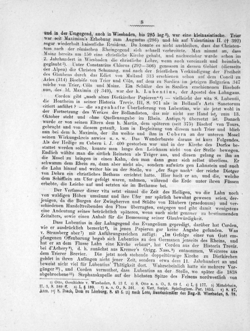und in der Umgegend, auch in Wiesbaden, bis 285 lag ²), war eine kleinasiatische. Trier war seit Maximian's Erhebung zum Augustus(286) und bis auf Valentinian II.(† 392) sogar wiederholt kaiserliche Residenz. Da konnte es nicht ausbleiben, dass das Christen- tum nach der römischen Rheingegend sich schnell verbreitete. Man nimmt an, dass Mainz bereits um 150 eine christliche Kirche gehabt, und nachweisbar wurde schon im 2. Jahrhundert in Wiesbaden die christliche Lehre, wenn auch vereinzelt und heimlich, geglaubt ³). Unter Constantius Chlorus(292— 306) genossen in dessen Gebiet(diesseits der Alpen) die Christen Schonung, und nach der feierlichen Verkündigung der Preiheit des Glaubens durch das Ediet von Mailand 313 erschienen schon auf dem Concil zu Arles(314) Bischöfe von Trier und Cöln, auf dem zu Sardica im jetzigen Bulgarien 347 solche von Trier, Cöln und Mainz. Ein Schüler des in Sardica erschienenen Bischofs nun, des hl. Maximin(† 349), war der h. Lubenti us, der Apostel des Lahngaus.