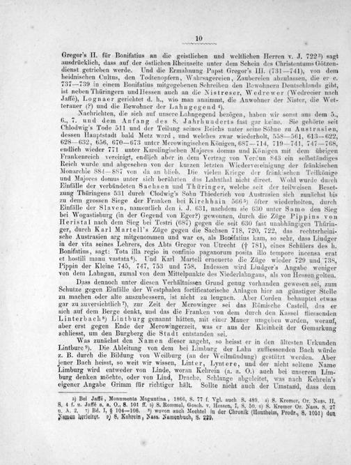 Nachrichten, die sich auf unsere Lahngegend bezögen, haben wir sonst aus dem 5., 6., 7. und dem Anfang des 8. Jahrhunderts fast gar keine. Sie gehörte seit Chlodwig’s Tode 511 und der Teilung seines Reichs unter seine Söhne zu Austrasien, dessen Hauptstadt bald Metz ward, und welches zwar wiederholt, 558— 561, 613— 622, 628— 632, 656, 670— 673 unter Merowingischen Königen, 687— 714, 719— 741, 747—768, endlich wieder 771 unter Karolingischen Majores domus und Köänigen mit dem übrigen Frankenreich vereinigt, endlich aber in dem Vertrag von Verdun 843 ein selbständiges Reich wurde und abgesehen von der kurzen letzten Wiedervereinigung der fränkischen Monarchie 884— 887 von da an blieb. Die vielen Kriege der fränkischen Teilkönige und Majores domus unter sich berührten das Lahnthal nicht direct. Wohl wurde durch Einfälle der verbündeten Sachsen und Thüringer, welche seit der teilweisen Beset- zung Thüringens 531 durch Clodwig's Sohn Thiederich von Austrasien sich zundchst bis zu dem grossen Siege der Franken bei Kirchhain 566 ⁵) öfter wiederholten, durch Einfälle der Slaven, namentlich den i. J. 631, nachdem sie 630 unter Samo den Sieg bei Wogastisburg(in der Gegend von Eger?) gewonnen, durch die Züge Pippins von Heristal nach dem Sieg bei Testri(687) gegen die seit 630 fast unabhängigen Thürin- ger, durch Karl Martell's Züge gegen die Sachsen 718, 720, 722, das rechtsrheini- sche Austrasien arg mitgenommen und war es, als Bomifatius kam, so sehr, dass Liudger in der vita seines Lehrers, des Abts Gregor von Utrecht(†⁵ 781), eines Schülers des h. Bonifatius, sagt: Tota illa regio in confinio paganorum posita illo tempore incensa erat et hostili manu vastata 6). Und Karl Martell erneuerte die Züge wieder 729 und, 738, Pippin der Kleine 745, 747, 753 und 758. Indessen wird Liudger's Angabe weniger von dem Lahngau, zumal von dem Mittelpunkte des Niederlahngaus, als von IHessen gelten.