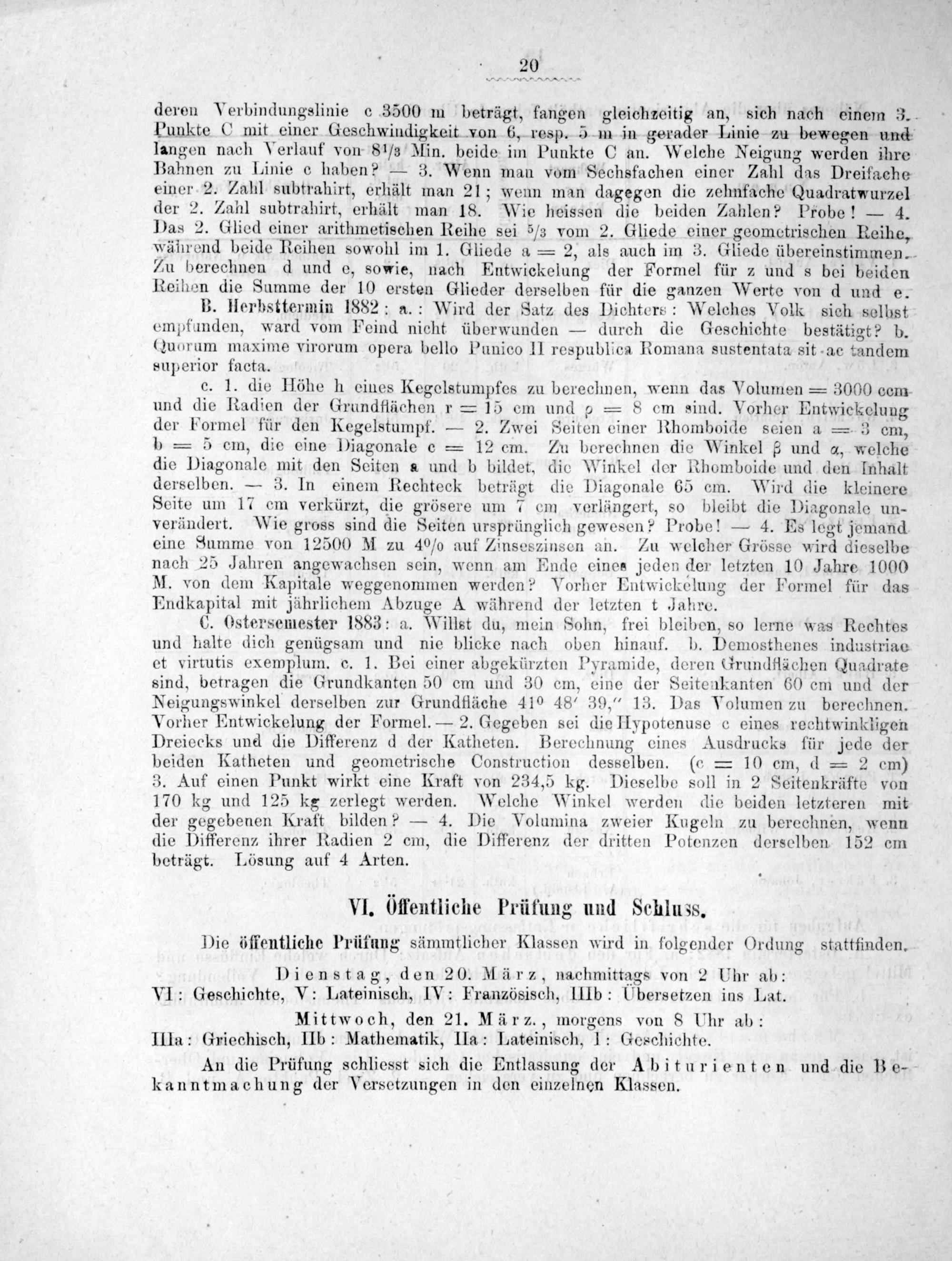 C. Ostersemester 1883: a. Willst du, mein Sohn, frei bleiben, so lerne was Rechtes und halte dich genügsam und nie blicke nach oben hinauf. b. Demosthenes industriae et virtutis exemplum. c. 1. Bei einer abgekürzten Pyramide, deren Grundflächen Quadrate sind, betragen die Grundkanten 50 cm und 30 cm, eine der Seitenkanten 60 cm und der Neigungswinkel derselben zur Grundfläche 41⁰ 48, 39,“ 13. Das Volumen zu berechnen. Vorher Entwickelung der Formel.— 2. Gegeben sei die Hypotenuse c eines rechtwinkligen Dreiecks und die Differenz d der Katheten. Berechnung eines Ausdrucks für jede der beiden Katheten und geometrische Construction desselben.(= 10 cm, d= 2 em) 3. Auf einen Punkt wirkt eine Kraft von 234,5 kg. Dieselbe soll in 2 Seitenkräfte von 170 kg und 125 kg zerlegt werden. Welche Winkel werden die beiden letzteren mit der gegebenen Kraft bilden?— 4. Die Volumina zweier Kugeln zu berechnen, wenn die Differenz ihrer Radien 2 cm, die Differenz der dritten Potenzen derselben 152 em beträgt. Lösung auf 4 Arten.