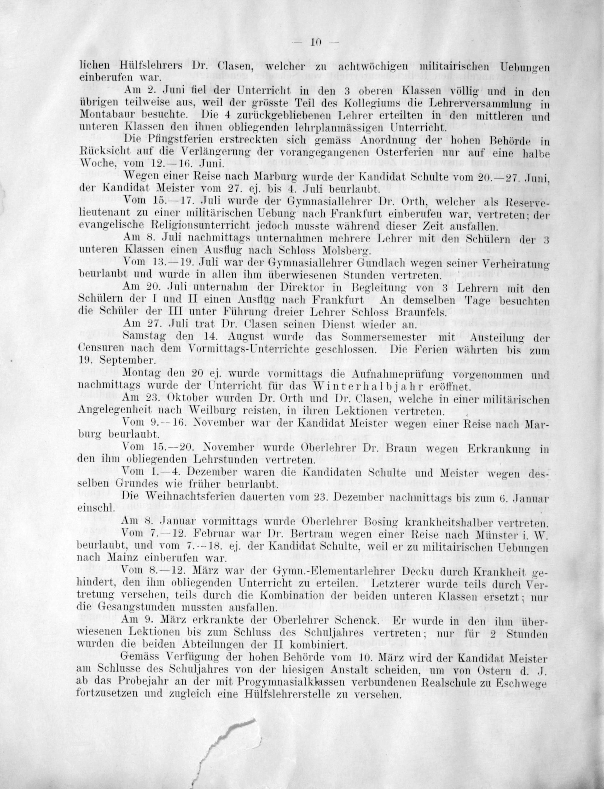 Vom 15.—17. Juli wurde der Gymnasiallehrer Dr. Orth, welcher als Reserve- lieutenant zu einer militärischen Uebung nach Frankfurt einberufen war, vertreten; der evangelische Religionsunterricht jedoch musste während dieser Zeit austallen.