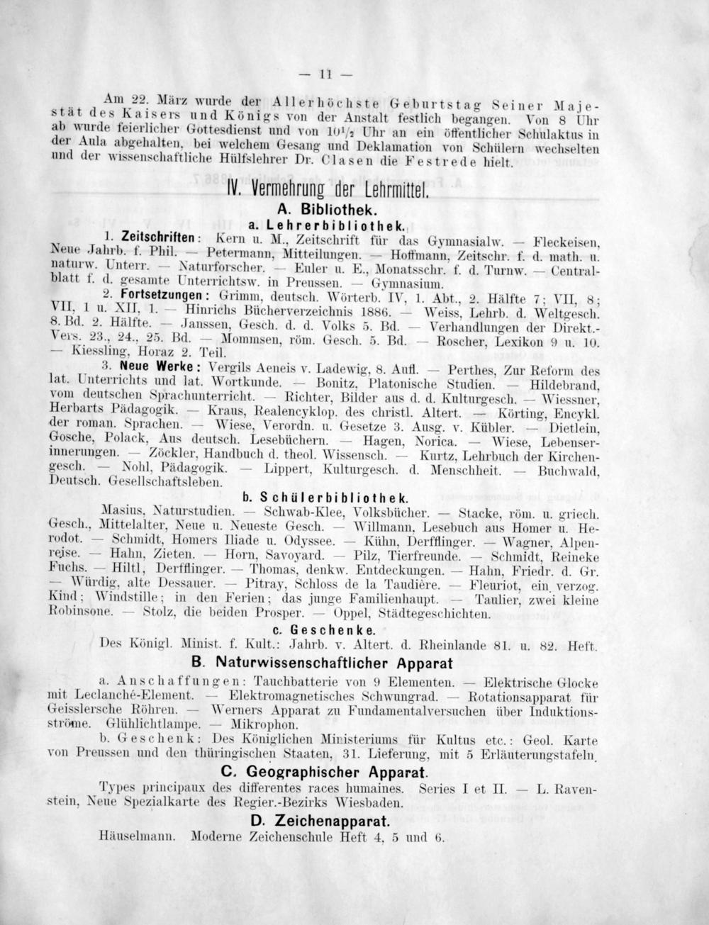 2. Fortsetzungen: Grimm, deutsch. Wörterb. IV, 1. Abt., 2. Hälfte 7; VII, 8; VII, 1 u. XII, 1.— Hinrichs Bücherverzeichnis 1886.— Weiss, Lehrb. d. Weltgesch. 8. Bd. 2. Hälfte.— Janssen, Gesch. d. d. Volks 5. Bd.— Verhandlungen der Direkt.- VerS. 23., 24., 25. Bd.— Mommsen, röm. Gesch. 5. Bd.— Roscher, Lexikon 9 u. 10. — Kiessling, Horaz 2. Teil. b