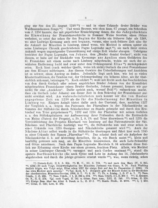 ging zur See den 25. August 1248 ²¹))— und in einer Urkunde dreier Brüder vom Waldmannshausen Zeuge ⁹²) Und wenn Brower, wie oben Anm. 67 gesagt, ein Schreiben vom J. 1250 kannte, das mit päpstlicher Ermächtigung denen, die das Jahrgedächtnis der Einweihung der Franziskanerkirche in frommer Weise feierten, einen Ablass verheisst, so setzt das schon für den Beginn der Kirche ein früheres Jahr als 1248, wo aber Ludwigs Kreuzzug auch erst begann, voraus, eine noch frühere Zeit also tür die Ankunft der Minoriten in Limburg, zumal wenn, wie Mechtel in seinem später als. seine Limburger Chronik geschriebenen Pagus Logenahe sagt ³³), sie nach ihrer ersten Ankunft wegen ungenügender Unterstützung auf einige Zeit wieder abzogen. Uebrigens berichtet der Pagus Logenahe, von Johann, dem„Bruder domini Gerlaci“, nicht von diesem, er habe auf der Rückkehr vom Kreuzzuge aus Apulien einen Gefährten des bl. Franziskus mit einem socius nach Limburg mitgebracht, wohin sie nach der er- wähnten Entfernung bald und zwar unter dem Ordensgeneral Elias ²⁴) zurückgekehrt. seien. Reck lässt(nach welcher Quelle, weiss ich nicht) Gerlach die zwei Franziskaner aus dem Elsass mitbringen. Aus diesem Gewirre der Ueberlieferungen und Ansichten ist es schwer, einen Ausweg zu finden. Jedenfalls liegt auch hier, wie bei so vielen Klostertraditionen, die Tendenz vor, der Ordensgründung ein höheres Alter, als ihr that- sächlich zukommt, beizulegen ⁹⁵). Koch erklärt ⁵⁰) wohl mit Recht auch das Geschichtchen von dem durch Gerlach oder seinen angeblichen Bruder Johann von der Kreuzfahrt mitgebrachten Franziskaner(einen Bruder Gerlachs, Johann genannt, kennen wir gar nicht) für eine„Anekdote“. Dafür spricht auch, worauf Bahl 97) aufmerksam macht, dass ein Gerlach(oder Johann) aus dieser Zeit in dem Nekrolog der Franziskaner gar. nicht erwähnt wird. Am wahrscheinlichsten noch kommt mir die von Hueber angegebene Zeit um 1230 als die für die Niederlassung der Minoriten in Limburg vor. Einigen Anhalt bietet dafür auch der Umstand, dass, nachdem 1227 der Vergleich u. a. wegen des Patronats des Pfarraltars in der Nikolauskirche zu Gunsten der Stiftskirche durch Schiedsrichter zu Stande gebracht und durch den Erz- bischof von Trier gutgeheissen ⁹⁸), 1232 uud 1234 der Pfarraltar mit seinen Gefällen u. a. den Stiftskapitularen zur Aufbesserung ihrer Präbenden durch die Erzbischöfe von Mainz(Patron der Propstei, s. Pr. I, S. 19) und Trier überwiesen ⁹⁹) und 1235 die Verzichtleistung des Propstes Eberhard von Isenburg auf das Patronatsrecht der Skt. Nikolaus- und Pfarrkirche bestätigt war ¹⁰⁰), die Stiftskirche nun und zwar schon in einer Urkunde von 1235 Georgen- und Nikolaikirche genannt wird ¹⁰¹½»j. Auch der Nikolaus-Altar selbst wurde in die Stiftskirche übertragen und führt hier noch 1345 in einer Urkunde den Namen„Pfarraltar“ ¹⁰²), Das scheint doch auf ein Aufgeben der Nikolauskirche d. h. auf Abtretung derselben, die ja, wie Busch meint ¹⁰³)„, klein und baufällig gewesen sein mag, an die Minoriten hinzuweisen, die auch Lotz-Schneider und Götze annehmen. Nach dem Pagus Logenahe Mechtels S. 34 erhielten diese frei- lich zur Erbauung einer Kirche nur einen grossen, feuchten Platz. Allein, wie Mechtel in seiner Limburger Chronik ¹⁰⁴) vermutet und auch Corden annimmt ¹⁰⁸), stand die spätere Barfüsserkirche(die nach Götze und Lotz im Anfang des 14. Jahrhunderts abgebrochen und durch die jetzige grössere ersetzt wurde ¹⁰⁶), was, wenn richtig, schon