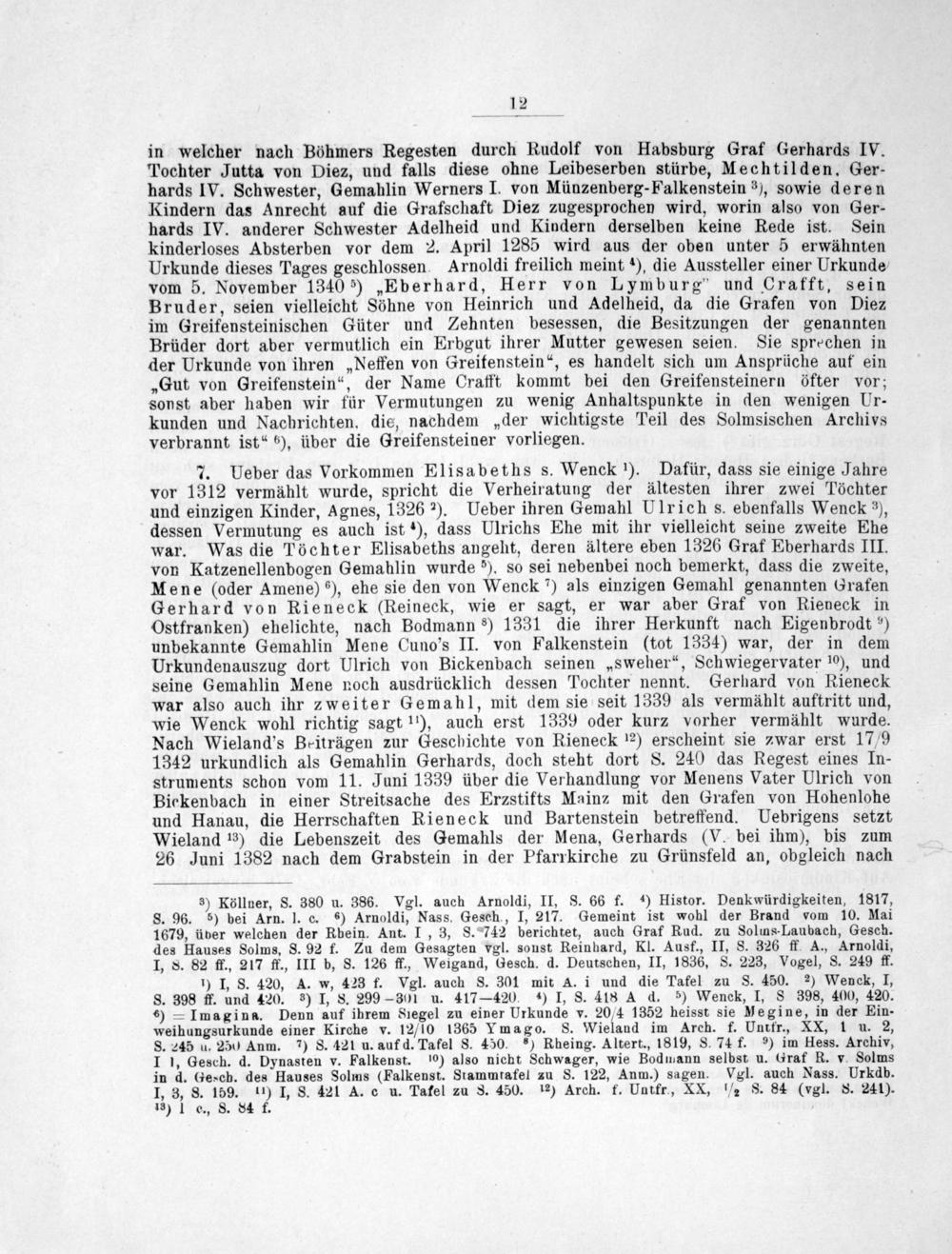 in welcher nach Böhmers Regesten durch Rudolf von Habsburg Graf Gerhards IV. Tochter Jutta von Diez, und falls diese ohne Leibeserben stürbe, Mechtilden. Ger- hards IV. Schwester, Gemahlin Werners I. von Münzenberg-Falkenstein ³), sowie deren Kindern das Anrecht auf die Grafschaft Diez zugesprochen wird, worin also von Ger- hards IV. anderer Schwester Adelheid und Kindern derselben keine Rede ist. Sein kinderloses Absterben vor dem 2. April 1285 wird aus der oben unter 5 erwähnten Urkunde dieses Tages geschlossen. Arnoldi freilich meint ⁴), die Aussteller einer Urkunde vom 5. November 1340 ⁵)„Eberhard, Herr von Lymburg und Crafft, sein Bruder, seien vielleicht Söhne von Heinrich und Adelheid, da die Grafen von Diez im Greifensteinischen Güter und Zehnten besessen, die Besitzungen der genannten Brüder dort aber vermutlich ein Erbgut ihrer Mutter gewesen seien. Sie sprechen in der Urkunde von ihren„Neffen von Greifenstein“, es handelt sich um Ansprüche auf ein „Gut von Greifenstein“, der Name Crafft kommt bei den Greifensteinern öfter vor; sonst aber haben wir für Vermutungen zu wenig Anhaltspunkte in den wenigen Ur- kunden und Nachrichten. die, nachdem„der wichtigste Teil des Solmsischen Archivs verbrannt ist“ ⁶), über die Greifensteiner vorliegen.