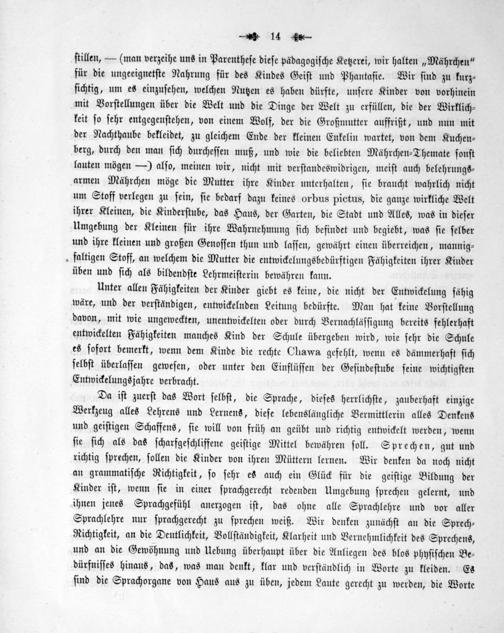 Unter allen Fähigkeiten der Kinder giebt es keine, die nicht der Entwickelung fähig wäre, und der verſtändigen, entwickelnden Leitung bedürfte. Man hat keine Vorſtellung davon, mit wie ungeweckten, unentwickelten oder durch Vernachläſſigung bereits fehlerhaft entwickelten Fähigkeiten manches Kind der Schule übergeben wird, wie ſehr die Schule es ſofort bemerkt, wenn dem Kinde die rechte Chawa gefehlt, wenn es dämmerhaft ſich ſelbſt überlaſſen geweſen, oder unter den Einflüſſen der Geſindeſtube ſeine wichtigſten Entwickelungsjahre verbracht.