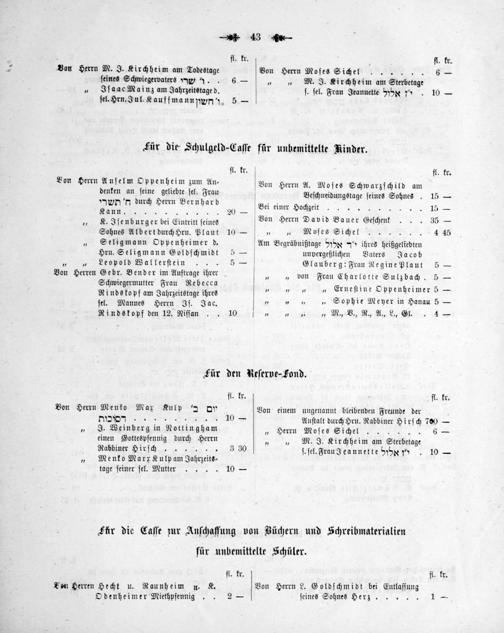 ſ. ſel. Frau Jeannette Ho 10 ſel. Hrn. Jul Kauffmann w n. 5— Für die Schulgeld-Caſſe für unbemittelte Rinder. fl. kr. fl 3 Von Herrn A. Moſes Schwarzſchild am denken an ſeine geliebte ſel. Frau Beſchneidungstage ſeines Sohnes. 15 n durch Herrn Bernhard 20[Bei einer Hochzeit........ 15 5 Herrn David Bauer Geſchent... 35 Sohnes Albert durch Hru. Plaut 10—„„ Moſes Sichel..... 4 um Begräbnißtage 5 5—“ ihres heiggeliebten Hrn. Seligmann Goldſchmidt 5— unvergeßlichen Vaters Jacob 5— Glauberg: Frau Regine Plaut 5 „„ von Frau Charlotte Sulzbach. 5 4. Rebecca„„„„ Erneſtine Oppenheimer 5 Rindskopf am Jahrzeitstage ihres 3 3 Herrn Iſ. Jac.„„„„ Sophie Meyer in Hanau 5 10 o„„ M., B., R., A., L., Gl. 4