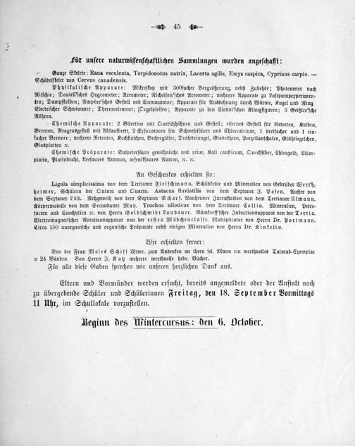 Ligula simplicissima von dem Tertianer Fleiſchmann. Schildkröte und Mineralien von Gebrüder Werth⸗ heimer, Schülern der Quinta und Quarta. Astacus fluviatilis von dem Sextaner J. Poſen. Auſter von dem Sextaner Löb. Rehgeweih von dem Sextaner Scharf. Nauheimer Incruſtation von dem Tertianer Ulmann. Körpermodelle von dem Secundaner May. Trochus niloticus von dem Tertianer Collin. Mineralien, Petre⸗ facten und Conchylien ꝛc. von Herrn Goldſchmidt Landauer. Rümkorff'ſcher Inductionsapparat von der Tertia. Electromagnetiſcher Rotationsapparat von der erſten Mädchenclaſſe. Multiplicator von Herrn Dr. Portmann. Circa 150 unorganiſche und organiſche Präparate nebſt einigen Mineralien von Herrn Dr. Kinkelin.