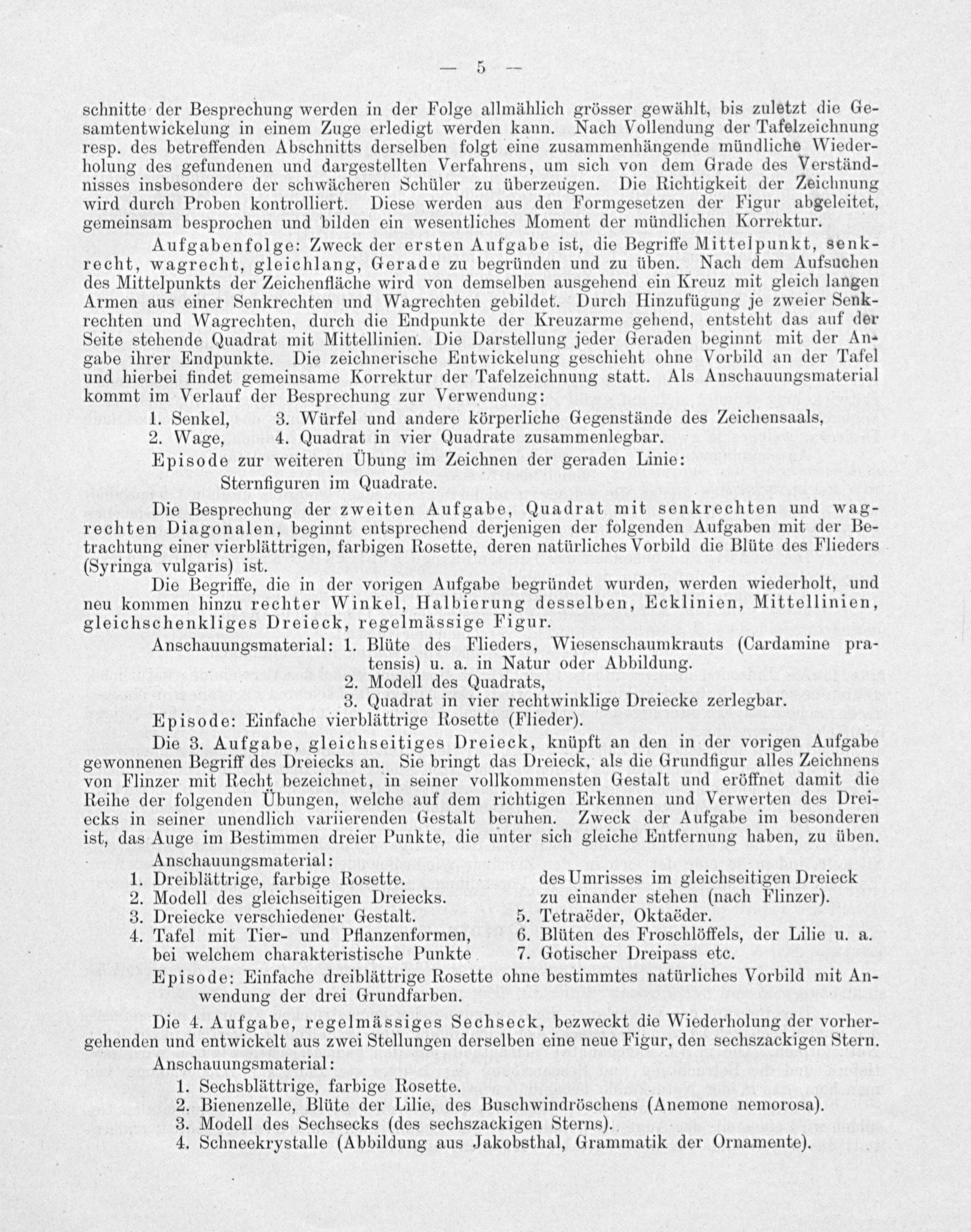 Die 4. Aufgabe, regelmässiges Sechseck, bezweckt die Wiederholung der vorher- gehenden und entwickelt aus zwei Stellungen derselben eine neue Figur, den sechszackigen Stern. Anschauungsmaterial: 1. Sechsblättrige, farbige Rosette. 2. Bienenzelle, Blüte der Lilie, des Buschwindröschens(Anemone nemorosa). 3. Modell des Sechsecks(des sechszackigen Sterns). 4. Schneekrystalle(Abbildung aus Jakobsthal, Grammatik der Ornamente).