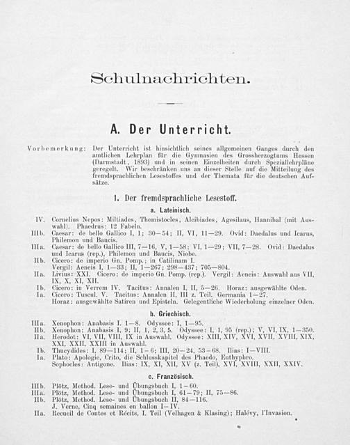 amtlichen Lehrplan für die Gymnasien des Grossherzogtums Hessen (Darmstadt, 1893) und in seinen Einzelheiten durch Speziallehrpläne geregelt. Wir beschränken uns an dieser Stelle auf die Mitteilung des fremdsprachlichen Lesestoffes und der Themata für die deutschen Auf- sätze.