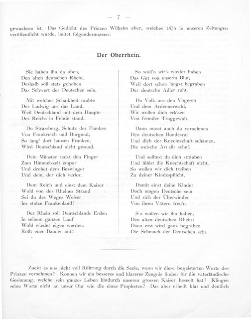Zuckt es uns nicht voll Rührung durch die Seele, wenn wir diese begeisterten Worte des Prinzen vernehmen? Können wir ein besseres und klareres Zeugnis finden für die vaterländische Gesinnung, welche sein ganzes Leben hindurch unseren grossen Kaiser beseelt hat? Klingen seine Worte nicht an unser Ohr wie die eines Propheten? Das aber erhellt klar und deutlich