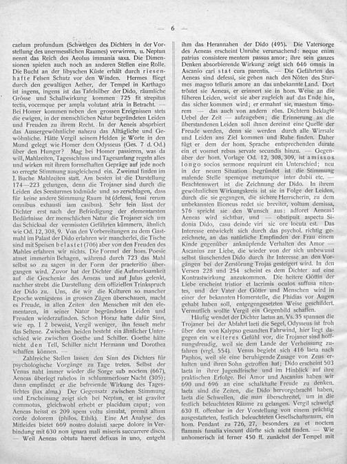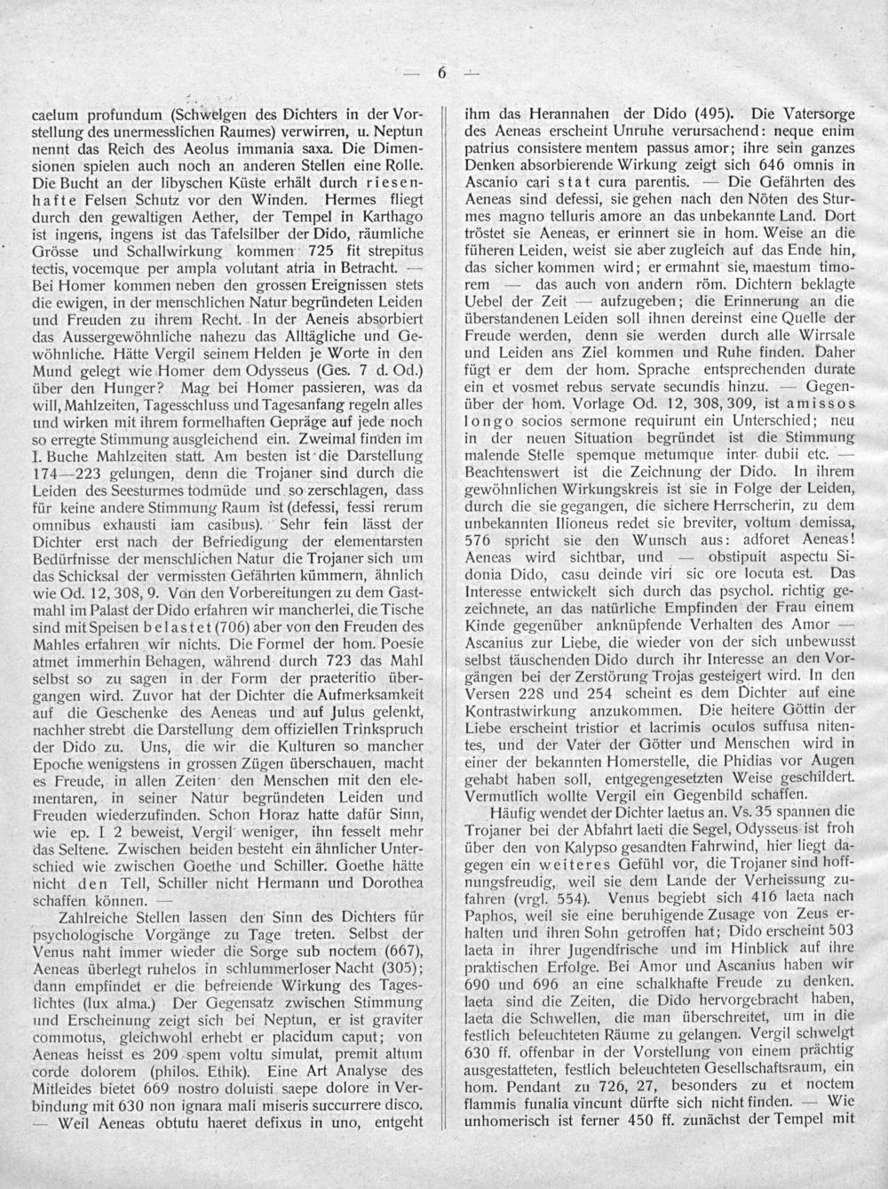 Zaahlreiche Stellen lassen den Sinn des Dichters für psychologische Vorgänge zu Tage treten. Selbst der Venus naht immer wieder die Sorge sub noctem(667), Aeneas überlegt ruhelos in schlummerloser Nacht(305); dann empfindet er die befreiende Wirkung des Tages- lichtes(lux alma.) Der Gegensatz zwischen Stimmung und Erscheinung zeigt sich bei Neptun, er ist graviter commotus, gleichwohl erhebt er placidum caput; von Aeneas heisst es 200 spem voltu simulat, premit altum corde dolorem(philos. Ethik). Eine Art Analyse des Mitleides bietet 660 nostro doluisti saepe dolore in Ver- bindung mit 630 non ignara mali miseris succurrere disco. — Weil Aeneas obtutu haeret defixus in uno, entgeht