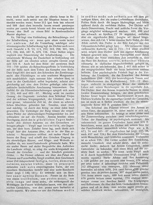 in aedibus nudo sub aetheris axe mit dem ge- waltigen Altare, den ein uralter Lorbeerbaum überschattet. Polites flieht durch die langen Säulengänge und blickt spähend durch die verödeten Hallen. Der Dichter will durch Dimensionen, Pracht und zeitliche Ferne die Vor- gänge möglichst wirkungsvoll machen. 489, 490 sind nur schwach an Apollon. IV 26 angelehnt, enthalten aber ein ergreifendes Bild.(verglw. sei darauf hinge- wiesen, dass sich Od. V keine einzelne Stelle findet, die den Affekt enthält, den Preller in das Bild Kalypso aus den Odysseelandschaften gelegt hat.)— Alte verlassene, einst vielbesuchte Kultorte, wie II 713—714 einer erwähnt wird, mögen dem Dichter auch aus eigener Anschauung bekannt gewesen sein.— Dem Naturgefühl einer durch die Kultur der Natur entrückten Zeit entspricht es, dass das Haus des Anchises secreta, arboribus obtecta villenartig in idyllischer Abgeschiedenheit gelegen ist, ebenso wie es uns befremdet, dass I 441 sich mitten in der neugegründeten Stadt ein lucus laetissimus umbrae befindet. Eine psychologische Feinheit liegt in der Ver- kettung der Umstände, die das Erwachen des Aceneas herbeiführen(268— 302)(der beunruhigende Traum und das Näherkommen des Waffenlärmes.) 310—12 über- tragen vielleicht in einzigartiger Weise das städtische Leben mit seinen Beziehungen in die sagenhafte Zeit. Der Dichter lässt den Aeneas trojanische Namen in einen localen Zusammenhang bringen, der dem griechischen Dichter ferner liegen musste. Beachtenswert ist auch des Dichters Vorliebe für die eigenartige Gestalt der Cassandra, (sie ist noch an 6 Stellen erwähnt) die ihn die stimm- ungsvolle Scene 402 ff. gestalten liess.—