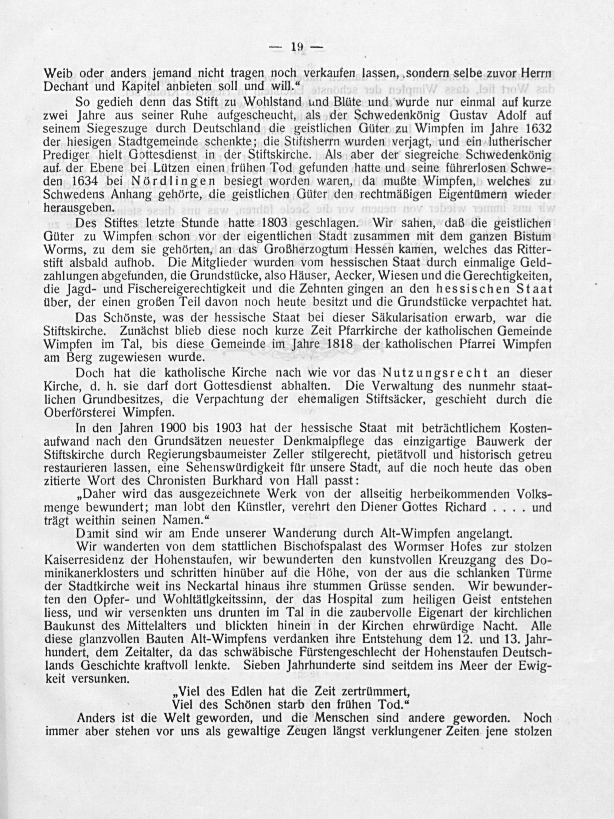 So gedieh denn das Stift zu Wohlstand und Blüte und wurde nur einmal auf kurze zwei Jahre aus seiner Ruhe aufgescheucht, als der Schwedenkönig Gustav Adolf auf seinem Siegeszuge durch Deutschland die geistlichen Güter zu Wimpfen im Jahre 1632 der hiesigen Stadtgemeinde schenkte; die Stiftsnerrn wurden verjagt, und ein lutherischer Prediger hielt Gottesdienst in der Stiftskirche. Als aber der siegreiche Schwedenkönig auf der Ebene bei Lützen einen frühen Tod gefunden hatte und seine führerlosen Schwe- den 1634 bei Nördlingen besiegt worden waren, da mußte Wimpfen, welches zu Schwedens Anhang gehörte, die geistlichen Güter den rechtmäßigen Eigentümern wieder herausgeben.