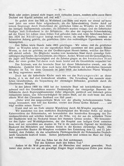 Wir wanderten von dem stattlichen Bischofspalast des Wormser Hofes zur stolzen Kaiserresidenz der Hohenstaufen, wir bewunderten den kunstvollen Kreuzgang des Do- minikanerklosters und schritten hinüber auf die Höhe, von der aus die schlanken Türme der Stadtkirche weit ins Neckartal hinaus ihre stummen Grüsse senden. Wir bewunder- ten den Opfer- und Wohltätlgkeitssinn, der das Hospital zum heiligen Geist entstehen liess, und wir versenkten uns drunten im Tal in die zaubervolle Eigenart der kirchlichen Baukunst des Mittelalters und blickten hinein in der Kirchen ehrwürdige Nacht. Alle diese glanzvollen Bauten Alt-Wimpfens verdanken ihre Entstehung dem 12. und 13. Jahr- hundert, dem Zeitalter, da das schwäbische Fürstengeschlecht der Hohenstaufen Deutsch- lands Geschichte kraftvoll lenkte. Sieben Jahrhunderte sind seitdem ins Meer der Ewig- keit versunken.