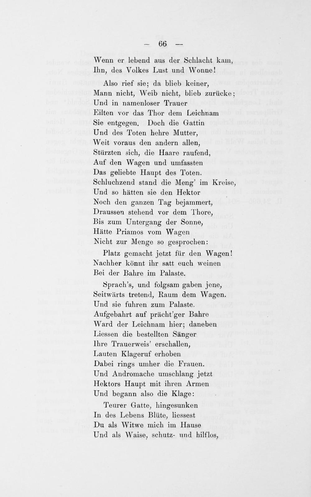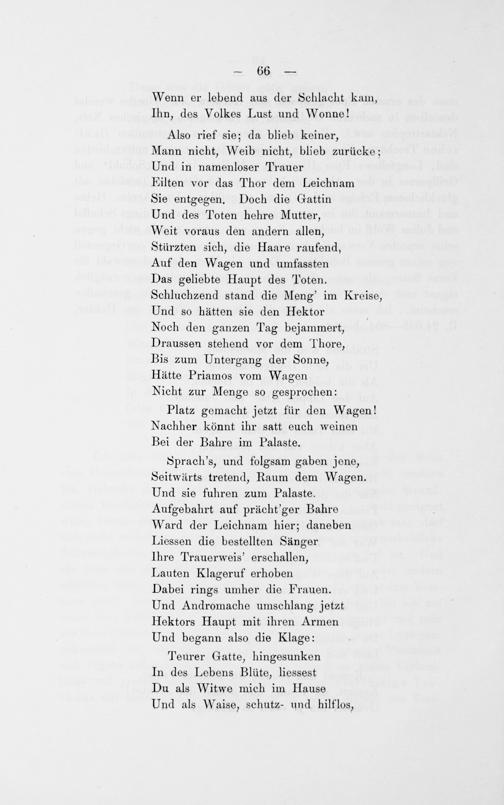 Also rief sie; da blieb keiner, Mann nicht, Weib nicht, blieb zurücke; Und in namenloser Trauer Eilten vor das Thor dem Leichnam Sie entgegen. Doch die Gattin Und des Toten hehre Mutter, Weit voraus den andern allen, Stürzten sich, die Haare raufend, Auf den Wagen und umfassten Das geliebte Haupt des Toten. Schluchzend stand die Meng' im Kreise, Und so hätten sie den Hektor Noch den ganzen Tag bejammert, Draussen stehend vor dem Thore, Bis zum Untergang der Sonne, Hätte Priamos vom Wagen Nicht zur Menge so gesprochen: