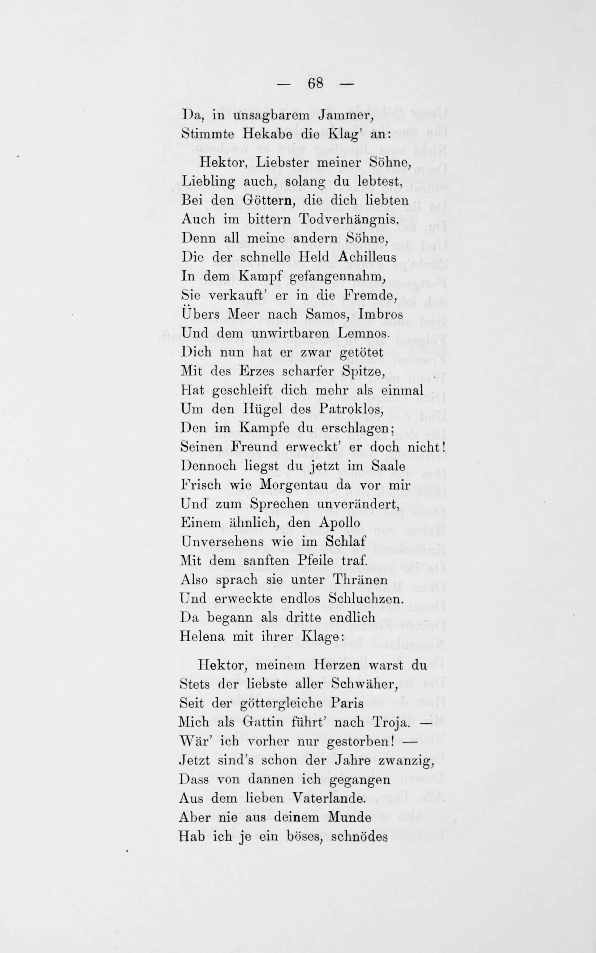 Hektor, meinem Herzen warst du Stets der liebste aller Schwäher, Seit der göttergleiche Paris Mich als Gattin führt' nach Troja.— Wär' ich vorher nur gestorben!— Jetzt sind's schon der Jahre zwanzig, Dass von dannen ich gegangen Aus dem lieben Vaterlande. Aber nie aus deinem Munde Hab ich je ein böses, schnödes