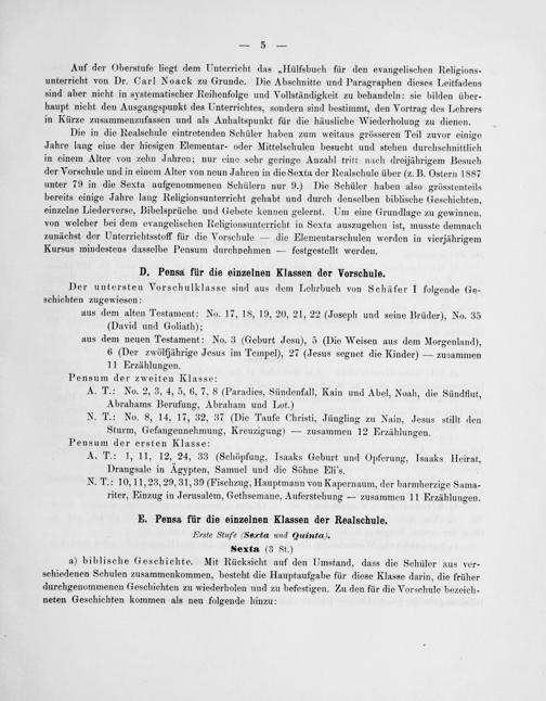 Die in die Realschule eintretenden Schüler haben zum weitaus grösseren Teil zuvor einige Jahre lang eine der hiesigen Elementar- oder Mittelschulen besucht und stehen durchsehnittlich in einem Alter von zehn Jahren; nur eine sehr geringe Anzahl tritt nach dreijährigem Besuch der Vorschule und in einem Alter von neun Jahren in die Sexta der Realschule über(z. B. Ostern 1887 unter 79 in die Sexta aufgenommenen Schülern nur 9.) Die Schüler haben also grösstenteils bereits einige Jahre lang Religionsunterricht gehabt und durch denselben biblische Geschichten, einzelne Liederverse, Bibelsprüche und Gebete kennen gelernt. Um eine Grundlage zu gewinnen, von welcher bei dem evangelischen Religionsunterricht in Sexta auszugehen ist, musste demnach zunächst der Unterrichtsstoff für die Vorschule— die Elementarschulen werden in vierjährigem Kursus mindestens dasselbe Pensum durchnehmen— festgestellt werden.