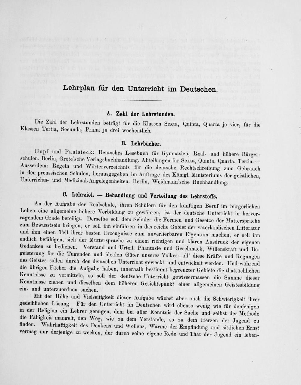 Hopf und Paulsieck: Deutsches Lesebuch für Gymnasien, Roal- und höhere Bürger- schulen. Berlin, Grote'sche Verlagsbuchhandlung. Abteilungen für Sexta, Quinta, Quarta, Tertia.— Ausserdem: Regeln und Wörterverzeichnis für die deutsche Rechtschreibung zum Gebrauch in den preussischen Schulen, herausgegeben im Auftrage des Königl. Ministeriums der geistlichen, Unterrichts- und Medizinal-Angelegenheiten. Berlin, Weidmann'sche Buchhandlung.