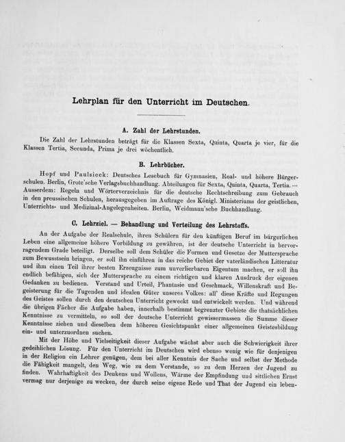 An der Aufgabe der Realschule, ihren Schülern für den künftigen Beruf im bürgerlichen Leben eine allgemeine höhere Vorbildung zu gewähren, ist der deutsche Unterricht in hervor- ragendem Grade beteiligt. Derselbe soll dem Schüler die Formen und Gesetze der Muttersprache zum Bewusstsein bringen, er soll ihn einführen in das reiche Gebiet der vaterländischen Litteratur und ihm einen Teil ihrer besten Erzeugnisse zum unverlierbaren Eigentum machen, er soll ihn endlich befähigen, sich der Muttersprache zu einem richtigen und klaren Ausdruck der eigenen Gedanken zu bedienen. Verstand und Urteil, Phantasie und Geschmack, Willenskraft und Be- geisterung für die Tugenden und idealen Güter unseres Volkes: all' diese Kräfte und Regungen des Geistes sollen durch den deutschen Unterricht geweckt und entwickelt werden. Und während die übrigen Fächer die Aufgabe haben, innerhalb bestimmt begrenzter Gebiete die thatsächlichen Kenntnisse zu vermitteln, so soll der deutsche Unterricht gewissermassen die Summe dieser Kenntnisse ziehen und dieselben dem höheren Gesichtspunkt einer allgemeinen Geistesbildung ein- und unterzuordnen suchen.