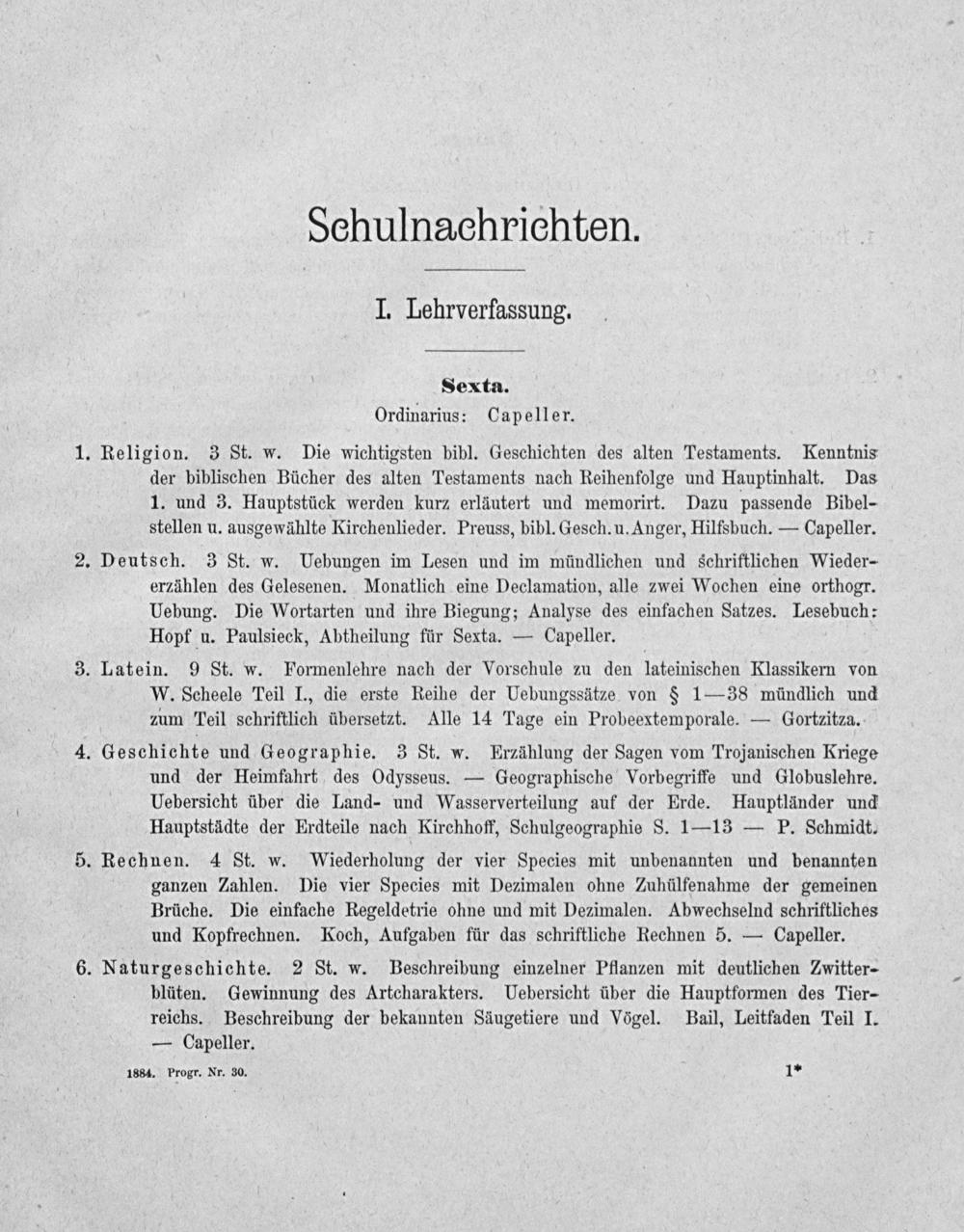 3. Latein. 9 St. w. Formenlehre nach der Vorschule zu den lateinischen Klassikern von W. Scheele Teil I., die erste Reihe der Uebungssätze von§ 1—38 mündlich und zum Teil schriftlich übersetzt. Alle 14 Tage ein Probeextemporale.— Gortzitza.