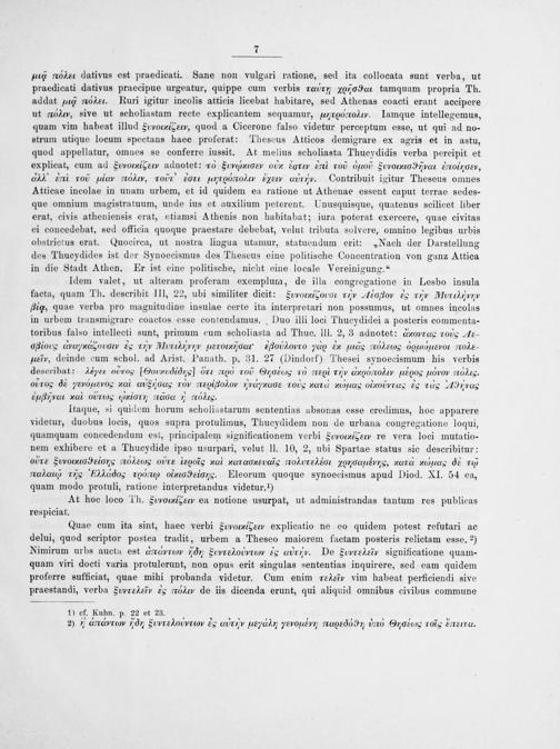 Idem valet, ut alteram proferam exemplum, de illa congregatione in Lesbo insula facta, quam Th. describit III, 22, ubi similiter dicit: Suννονκιεοινσι μι‿¶⁴2ε‿σμονννςσ τẽvi△ Hur*ννν Big, quae verba pro magnitudine insulae certe ita interpretari non possumus, ut omnes incolas in urbem transmigrare coactos esse contendamus. Duo illi loci Thucydidei a posteris commenta- toribus falso intellecti sunt, primum cum scholiasta ad Thuc. III. 2, 3 adnotet: ονυαιαα ³τι é- ioνν αυέκ⁴ιμοννασσρ νιςι mτνννðł₰2eαeνννν2μμεοmνπιασασιν*ε⁵οιιοωνυιο ν⁴ς ετυιέ ττονενςι ⁶οιαιενοττε Meæεy, deinde cum schol. ad Arist. Panath. p. 31. 27(Dindorf) Thesei synoecismum his verbis describat: 14 ι᷑⁷υ ουοο[ou‿ν ο⁴*dνςι ö α̈ τον σεέσσι ⁶ Tε¹ T-*ν νπιιιιυννQάέοο 1μ⁴νονττ⁶ννις. 0iτοσ dε„ενmλμαρνοο να αmε ⁶σσ τν πέοειοοωννκά&να τοbς ντσακ⁴ νQωινωαςν ozνυννιασν ες eς A19ννυααφς 21ννναι mακ‿ οντπως τQα ν 1Qαοεε.