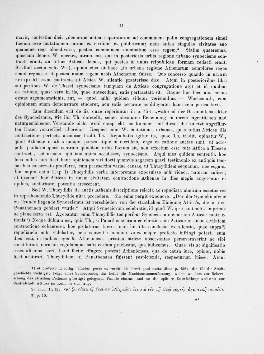 mayvit, confestim dicit„demorum antea separatorum ad communem polin congregationem simal factam esse mutationem iurum et civilium et publicarum; nam antea singulas civitates suo quamque regi oboedivisse, postea communem dominatum esse regem.“ Statim quaeremus, quosnam demos W. spectet, utrum eos, qui in posterioris urbis regione urbano synoecismo con- tracti erant, an totius Atticae demos, qui postea in unius reipublicae formam redacti erant. Si illud accipi velit W. ¹), opinio eius sit haec„in urbana regione Athenarum complures reges simul regnasse et postea unum regem urbis Athenarum fuisse. Quo concesso quando in unam rempublicam contracta sit Attica W. silentio praeterisse dico. Atqui in posterioribus libri sui partibus W. de Thesei synoecismo tamquam de Atticae congregatione agit et id quidem ea ratione, quasi vero in iis, quae antecedunt, satis pertractata sit. Itaque hoc loco aut lacuna exstat argumentationis, aut,— quod mihi quidem videtur verisimilius,— Wachsmuth, cum opinionem suam demonstrare studeret, non satis accurate ac diligenter hanc rem pertractavit.