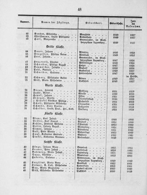 — Jahr Nummer. Namen der Zöglinge. Geburtsort. Geburtsjahr. der Aufnahme. 11 Bender, Eliſabetha.... Marxheim... 1849 1857 12 Chriſtmann, Louiſe Philippine.. Rettershain... 1849 1857 13 Hart, Margaretha...... Gevenmacher, im Groß⸗ herzogthum Luxemburg. 18⁴9 1857 Dritte Klaſſe. 14 Bauer, Johann....„. Altendiez.... 1850 1858 15 Drageſſer, Philipp Anton.. Weinbach.... 1849 1857 16 Hart, Johann........ Gevenmacher, im Groß⸗ herzogthum Luxemburg. 1847 1856 17 Heuzeroth, Theodor... Wölferlingen.... 1848 1858 18 Schneider, Philipp Auguſt. Haiger..... 1847 1858 19 Baumeiſter, Joſepha..... Neudorf.... 1850 1856 20 Pehl, arbarqa....... Gackenbach,.... 1849 1857 21 Schneider, Suſanna... Heddernheim.... 18⁴7 1858 im Herbſte. 22 Schwarz, Wilhelmine Roſine.. Arborn...... 1849 1857 23 Wüſt, Maria Wilhelmine.. Dickſchied... 1849 1857 Vierte Klaſſe. 24 Braun, Heinrich..... Weilburg..... 1851 1859 25 Fuchs, Robert... Eltville.... 1850 1858 26 Hewel, Johann...... Filſen. 1851 1859 27 Klärner, Martin.... Obertiefenbach.. 1848 1859 28 † Störkel Chriſtian Philipp.. Weſterfeld..... 1851 1859 29 Scheid, Philippine Eliſabetha. Oberneiſen..... 1351 1859 30 Schmidt, Klara Pauline.... Hallgarten..... 1851 1859 31 Schröder, Louiſe, Paul., Hel., Kath. Weilburg..... 1851 1859 Fünfte Klaſſe. 32 Blanc, Karl Joſeph.... Luxemburg. 1848 1860 33 Dröſer, Karl Konrad..... Neudorf...... 1851 1860 34 Keßler, Friedrich Wilhem... Offenbach. 1852 1860 35 Seiler, Ludwig Auguſt..... Marienberg..... 1851 1860 36 Simon, Johann....... Rüdesheim..... 1851 1860 37 Voll, Peter Martin.... Niederelbert.... 1852 1860 38 Hauf, Katharina Gertrude... Eſſchborn.... 185² 1860 39 Pinkel, Katharina Eleonora... Nordenſtadt..... 1849 1860 Hechſte Klaſſe. 40 Hönge, Johann Adam. Bermbach..... 1853 1861 41 Kremer, Peter Joſeph.. Haſſelbach. 1853 1861 42 Bodewing, Maria Joſeph... Luxemburg. 1821 1861 43 Dupp, Chriſtine. 1 Montabaur.. 1853 1861 44 Huberty, Suſanua..... Niederanven, im Groß⸗ herzogthum Luxemburg. 1849 1860 45 Korzilins, Maria Anna. Nansbach..... 1852 1861 46 Krämer, A. Kath. Wilhelmine. Rettershain. 1853 1861 47 May, Maria Magdalena. Niederbachheim... 1852 1860 48 Wüſt, Eliſabetha Wilhelmine.. Dickſchied..... 1850 1859
