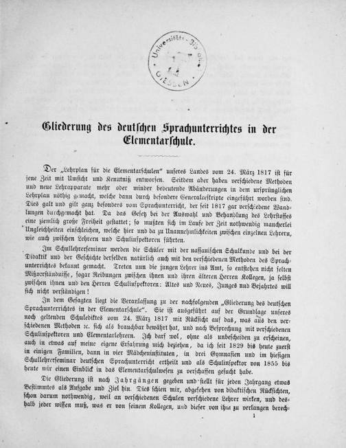 Der„Lehrplan für die Elementarſchulen“ unſeres Landes vom 24. März 1817 iſt für jene Zeit mit Umſicht und Kenntniß entworfen. Seitdem aber haben verſchiedene Methoden und neue Lehrapparate mehr oder minder bedeutende Abänderungen in dem urſprünglichen Lehrplan nöthig gemacht, welche dann durch beſondere Generalreſkripte eingeführt worden ſind. Dies galt und gilt ganz beſonders vom Sprachunterricht, der ſeit 1817 gar verſchiedene Wand⸗ lungen durchgemacht hat. Da das Geſetz bei der Auswahl und Behandlung des Lehrſtoffes eine ziemlich große Freiheit geſtattet; ſo mußten ſich im Laufe der Zeit nothwendig mancherlei