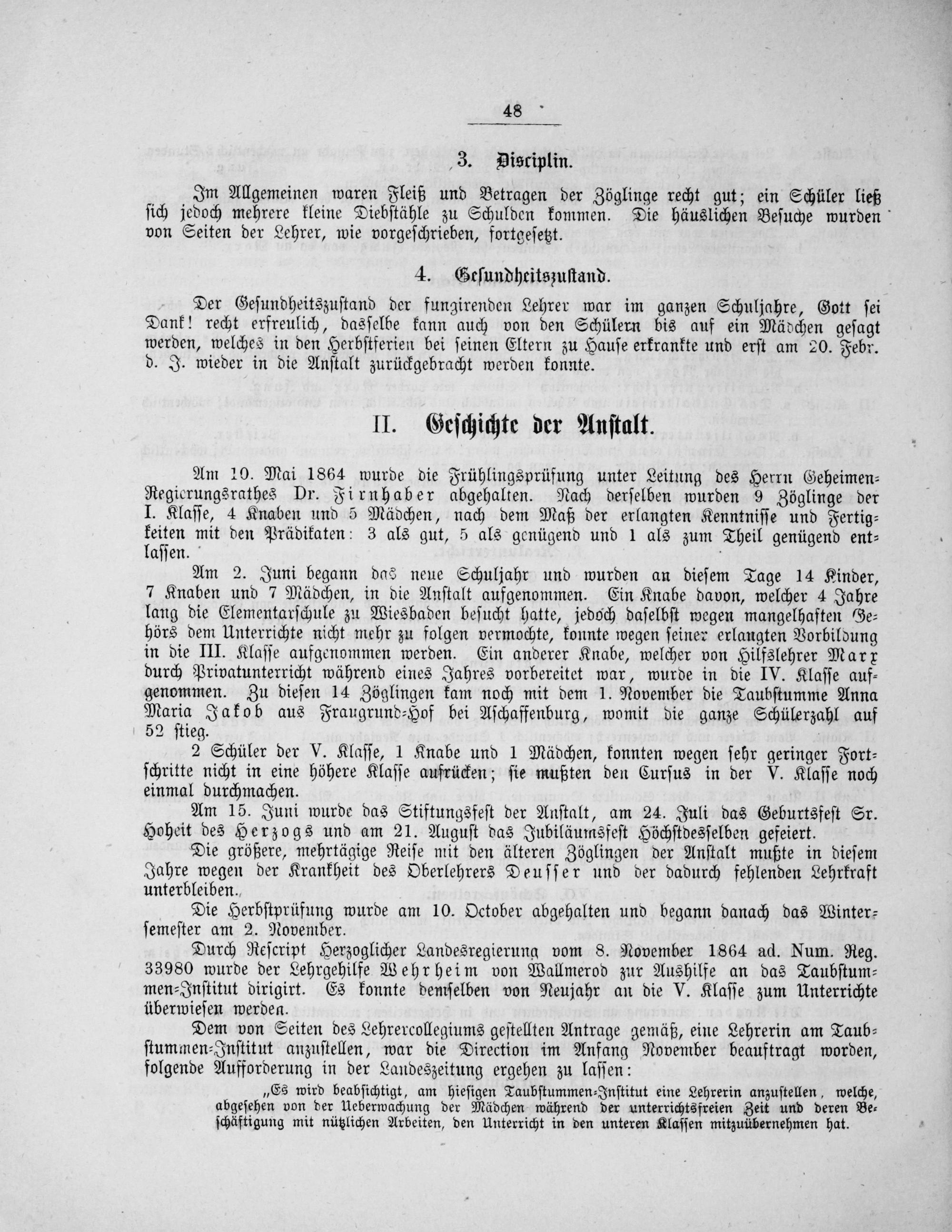 Durch Reſcript Herzoglicher Landesregierung vom 8. November 1864 ad. Num. Reg. 33980 wurde der Lehrgehilfe Wehrheim von Wallmerod zur Aushilfe an das Taubſtum⸗ men⸗Inſtitut dirigirt. Es konnte demſelben von Neujahr an die V. Klaſſe zum Unterrichte überwieſen werden.