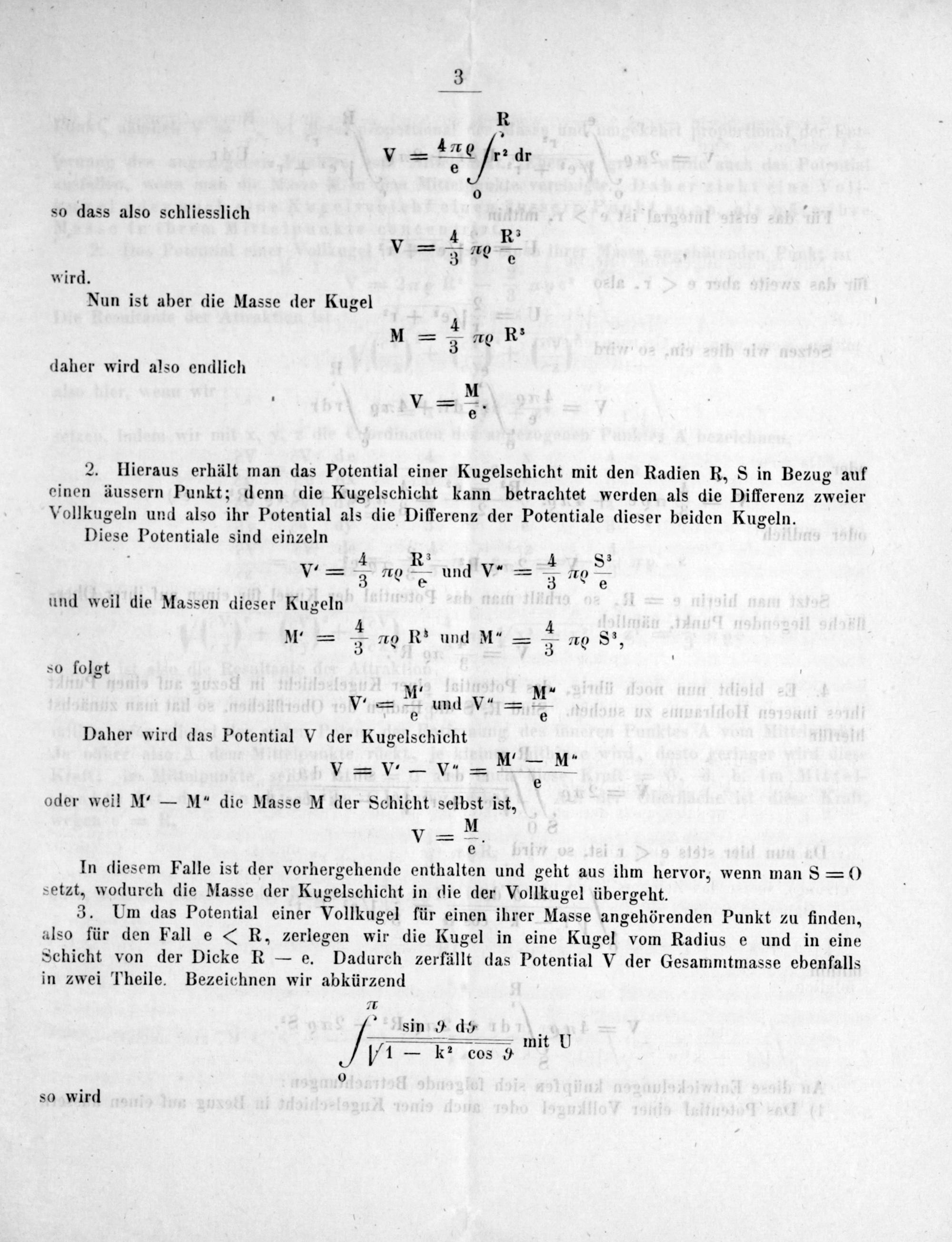 In diesem Falle ist der vorhergehende enthalten und geht aus ihm hervor, wenn man S= 0 Setzt, wodurch die Masse der Kugelschicht in die der Vollkugel übergeht.