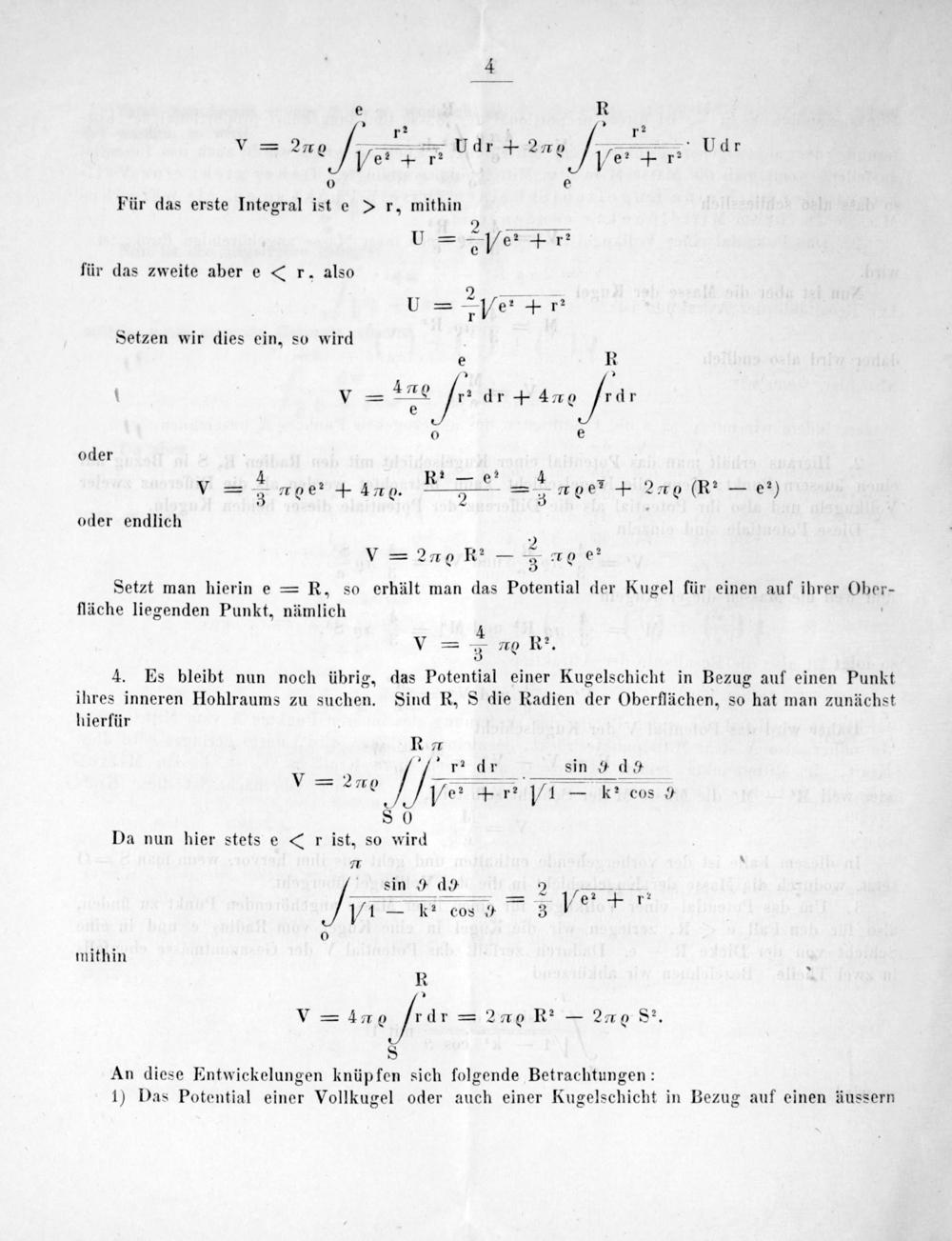 8 An diese Entwickelungen knüpfen sich folgende Betrachtungen: 1) Das Potential einer Vollkugel oder auch einer Kugelschicht in Bezug auf einen äussern