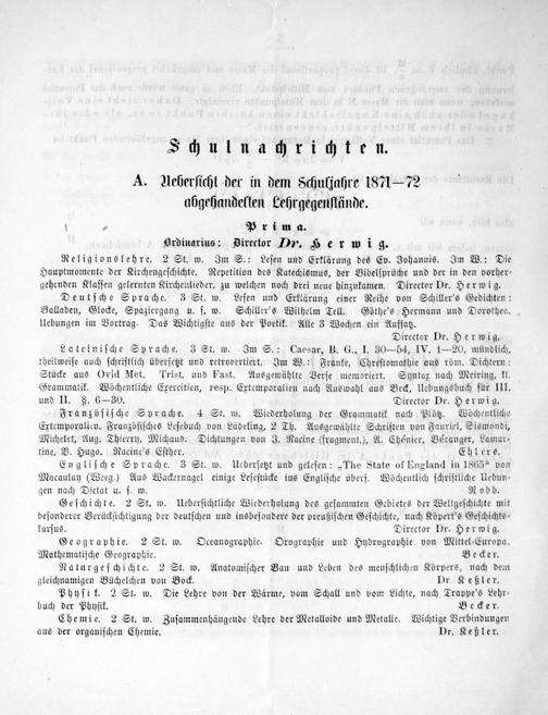 Lateiniſche Sprache. 3 St. w. Im S.: C(aesar, B. G., I. 30— 54, IV. 1— 20, mündlich, theilweiſe auch ſchriftlich überſetzt und retrovertiert. Im W.: Franke, Chreſtomathie aus röm. Dichtern: Stücke aus Ovid Met. Trist. und Fast. Ausgewählte Verſe memoriert. Syntax nach Meiring, kl. Grammatik. Wöchentliche Exercitien, resp. Extemporalien nach Auswahl aus Beck, Uebungsbuch für III. und II.§. 6— 30. Director Dr. Herwig.