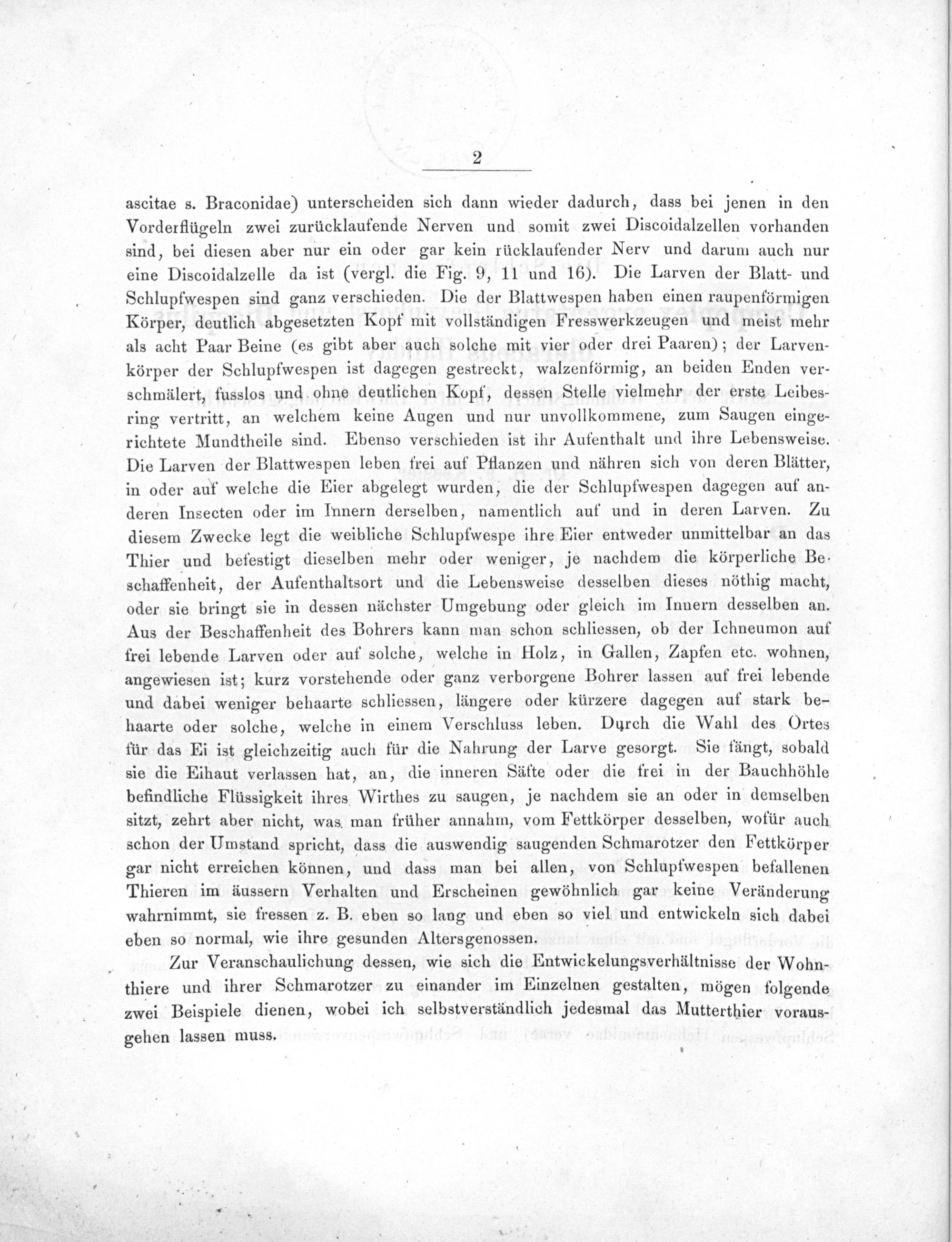ascitae s. Braconidae) unterscheiden sich dann wieder dadurch, dass bei jenen in den Vorderflügeln zwei zurücklaufende Nerven und somit zwei Discoidalzellen vorhanden sind, bei diesen aber nur ein oder gar kein rücklaufender Nerv und darum auch nur eine Discoidalzelle da ist(vergl. die Fig. 9, 11 und 16). Die Larven der Blatt- und Schlupfwespen sind ganz verschieden. Die der Blattwespen haben einen raupenförmigen Körper, deutlich abgesetzten Kopf mit vollständigen Fresswerkzeugen und meist mehr als acht Paar Beine(es gibt aber auch solche mit vier oder drei Paaren); der Larven- körper der Schlupfwespen ist dagegen gestreckt, walzenförmig, an beiden Enden ver- schmälert, fusslos und ohne deutlichen Kopf, dessen Stelle vielmehr der erste Leibes- ring vertritt, an welchem keine Augen und nur unvollkommene, zum Saugen einge- richtete Mundtheile sind. Ebenso verschieden ist ihr Aufenthalt und ihre Lebensweise. Die Larven der Blattwespen leben frei auf Pflanzen und nähren sich von deren Blätter, in oder auf welche die Eier abgelegt wurden, die der Schlupfwespen dagegen auf an- deren Insecten oder im Innern derselben, namentlich auf und in deren Larven. Zu diesem Zwecke legt die weibliche Schlupfwespe ihre Eier entweder unmittelbar an das Thier und befestigt dieselben mehr oder weniger, je nachdem die körperliche Be- schaffenheit, der Aufenthaltsort und die Lebensweise desselben dieses nöthig macht, oder sie bringt sie in dessen nächster Umgebung oder gleich im Innern desselben an. Aus der Beschaffenheit des Bohrers kann man schon schliessen, ob der Ichneumon auf frei lebende Larven oder auf solche, welche in Holz, in Gallen, Zapfen etc. wohnen, angewiesen ist; kurz vorstehende oder ganz verborgene Bohrer lassen auf frei lebende und dabei weniger behaarte schliessen, längere oder kürzere dagegen auf stark be- haarte oder solche, welche in einem Verschluss leben. Durch die Wahl des Ortes für das Ei ist gleichzeitig auch für die Nahrung der Larve gesorgt. Sie fängt, sobald sie die Eihaut verlassen hat, an, die inneren Säfte oder die frei in der Bauchhöhle befindliche Flüssigkeit ihres Wirthes zu saugen, je nachdem sie an oder in demselben sitzt, zehrt aber nicht, was man früher annahm, vom Fettkörper desselben, wofür auch schon der Umstand spricht, dass die auswendig saugenden Schmarotzer den Fettkörper gar nicht erreichen können, und dass man bei allen, von Schlupfwespen befallenen Thieren im äussern Verhalten und Erscheinen gewöhnlich gar keine Veränderung wahrnimmt, sie fressen z. B. eben so lang und eben so viel und entwickeln sich dabei eben so normal, wie ihre gesunden Altersgenossen.