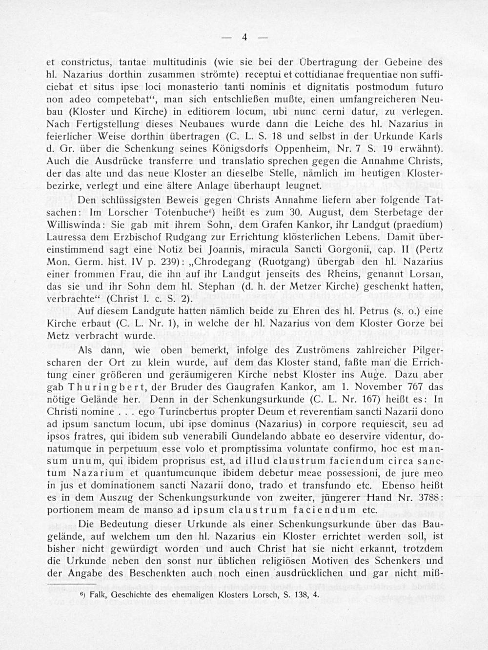 et constrictus, tantae multitudinis(wie sie bei der Ubertragung der Gebeine des hl. Nazarius dorthin zusammen strömte) receptui et cottidianae frequentiae non suffi- ciebat et situs ipse loci monasterio tanti nominis et dignitatis postmodum futuro non adeo competebat“, man sich entschließen mußte, einen umfangreicheren Neu- bau(Kloster und Kirche) in editiorem locum, ubi nunc cerni datur, zu verlegen. Nach Fertigstellung dieses Neubaues wurde dann die Leiche des hl. Nazarius in feierlicher Weise dorthin übertragen(C. L. S. 18 und selbst in der Urkunde Karls d. Gr. über die Schenkung seines Königsdorfs Oppenheim, Nr. 7 S. 19 erwähnt). Auch die Ausdrücke transferre und translatio sprechen gegen die Annahme Christs, der das alte und das neue Kloster an dieselbe Stelle, nämlich im heutigen Kloster- bezirke, verlegt und eine ältere Anlage überhaupt leugnet.