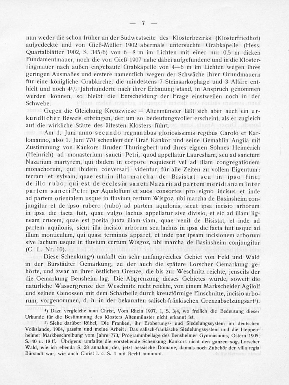 nun weder die schon früher an der Südwestseite des Klosterbezirks(Klosterfriedhof) aufgedeckte und von Gieß-Müller 1002 abermals untersuchte Grabkapeile(Hess. Quartalblätter 1902, S. 345/6) von 6— 8 m im Lichten mit einer nur 0,5 m dicken Fundamentmauer, noch die von Gieß 1007 nahe dabei aufgefundene und in die Kloster- ringmauer nach außen eingebaute Grabkapelle von 4—6 m im Lichten wegen ihres geringen Ausmaßes und erstere namentlich wegen der Schwäche ihrer Grundmauern für eine königliche Grabkirche, die mindestens 7 Steinsarkophage und 3 Altäre ent- hielt und noch 4 ½ Jahrhunderte nach ihrer Erbauung stand, in Anspruch genommen werden können, so bleibt die Entscheidung der Frage einstweilen noch in der Schwebe.