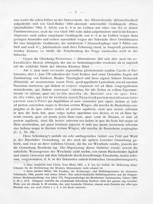 5) Siehe darüber Rübel, Die Franken, ihr Eroberungs- uud Siedelungssystem im deutschen Volkslande, 1904, passim und meine Arbeit: Das salisch-fränkische Siedelungssystem und die Heppen- heimer Markbeschreibung vom Jahre 773, Programmbeilage des Bensheimer Gymnasiums, Ostern 1905, S. 40 u. 18 ff. UÜbrigens umfaßte die vorstehende Schenkung Kankors nicht den ganzen sog. Lorscher Wald, wie ich ebenda S. 28 annahm, der, jetzt hessische Domäne, damals noch Zubehör der villa regia Bürstadt war, wie auch Christ l. c. S. 4 mit Recht annimmt.
