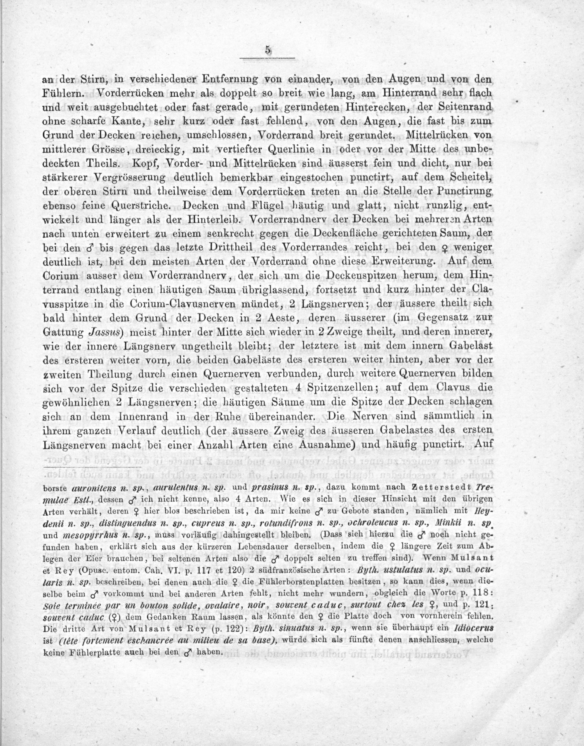 borste uuronitens n. sp., aurulentus n. sp. und prasinus n. sp., dazu kommt nach Zetterstedt Tre- mulae Esll., dessen G ich nicht kenne, also 4 Arten. Wie es sich in dieser Hinsicht mit den übrigen Arten verhält, deren · hier blos beschrieben ist, da mir keine ³ zu Gebote standen, nämlich mit Hey- denii n. sp., dislinguendus n. sp., cupreus n. sp., rotundifrons n. sp., ochroleucus n. sp., Minkii n. sp. und mesopyrrhus n. sp., muss vorläufig dahingestellt bleiben.(Dass sich hierzu die G noch nicht ge- funden haben, erklärt sich aus der kürzeren Lebensdauer derselben, indem die 2 längere Zeit zum Ab- legen der Eier brauchen, bei seltenen Arten also die G doppelt selten zu treffen sindz). Wenn Mulsant et Rey(Opusc. entom. Cah. VI. p. 117 et 120) 2 südfranzösische Arten: Byõh. ustulalus n. sp. und ocu- laris n. sp. beschreiben, bei denen auch die 2 die Fühlerborstenplatten besitzen, so kann dies, wenn die- selbe beim G vorkommt und bei anderen Arten fehlt, nicht mehr wundern, obgleich die Worte p. 118: soie terminée par un bouton solide, ovalaire, noir, sourent cadue, surtout chez les 9, und p. 121: souvent caduc() dem Gedanken Raum lassen, als könnte den die Platte doch von vornherein fehlen. Die dritte Art von Mulsant et Rey(p. 122): Byth. sinuatus n. sp., wenn sie überhaupt ein Idiocerus ist Ctéte fortement eschancrée au milien de sa base), würdé sich als fünfte denen anschliessen, welche keine Fühlerplatte auch bei den haben.