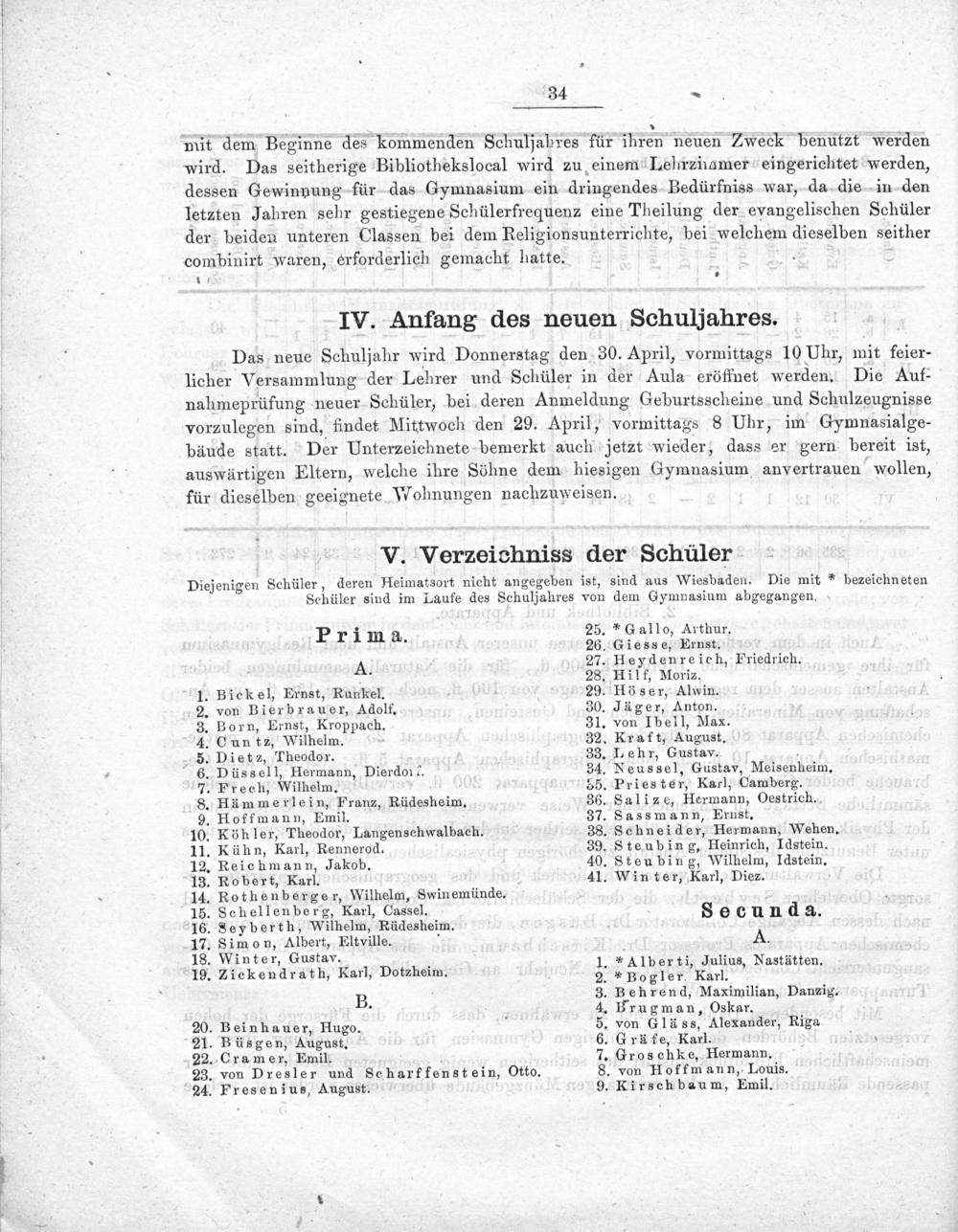 Diejenigen Schüler, deren Heimatsort nicht angegeben ist, sind aus Wiesbaden. Die mit* bezeichneten Schüler sind im Laufe des Schuljahres von dem Gymnasium abgegangen.
