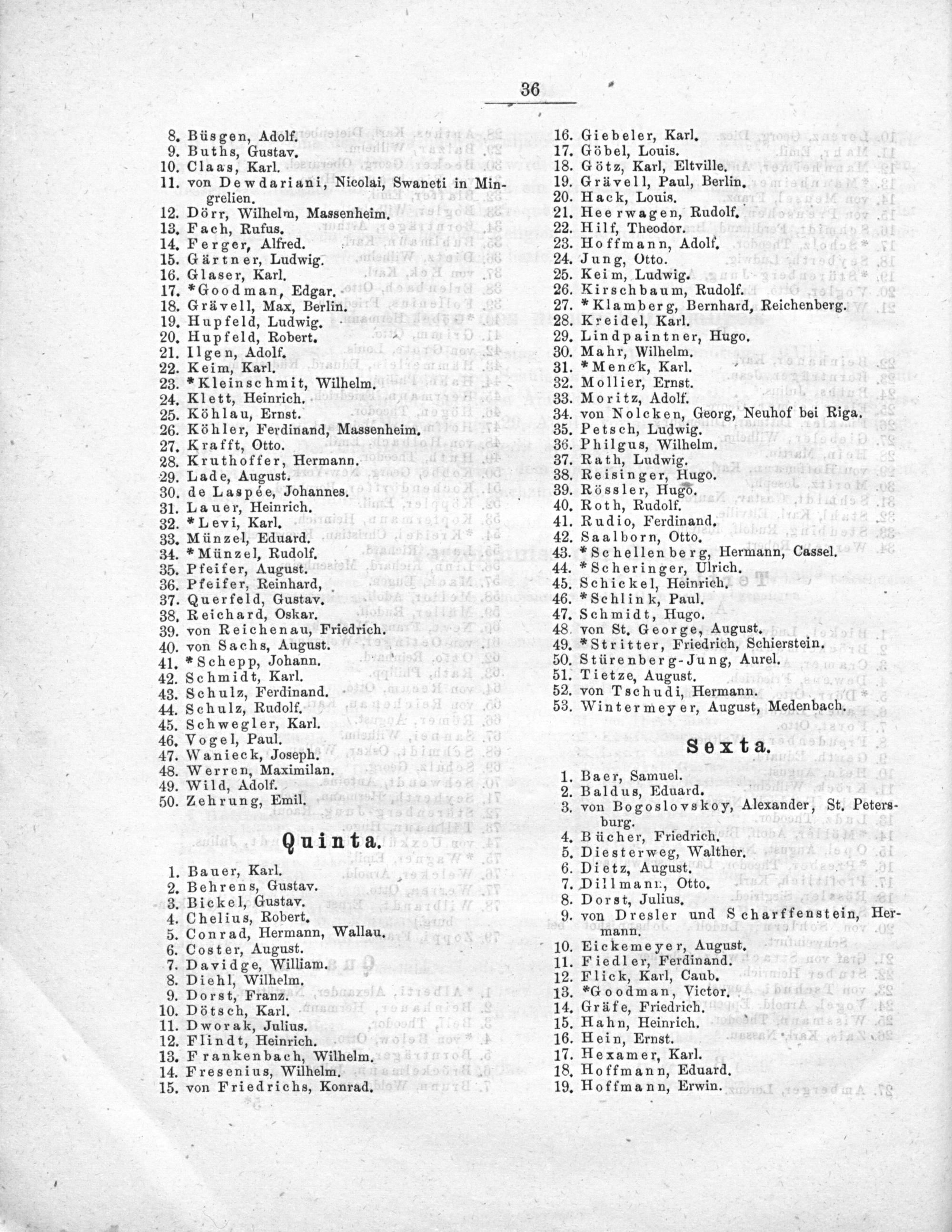 8. Büsgen, Adolf. 16. Giebeler, Karl. 9. Buths, Gustav.. 17. Göbel, Louis. 10. Claas, Karl. 18. Götz, Karl, Eltville. 11. von Dewdariani, Nicolai, Swaneti in Min- 19. Grävell, Paul, Berlin. grelien. 20. Hack, Louis.. 12. Dörr, Wilhelm, Massenheim. 21. Heerwagen, Rudolf. 13. Fach, Rufus. 22. Hilf, Theodor. 14. Ferger, Alfred. 23. Hoffmann, Adolf. 15. Gärtner, Ludwig. 24. Jung, Otto. 16. Glaser, Karl. 25. Keim, Ludwig. 17.*Goodman, Edgar. 26. Kirschbaum, Rudolf. 18. Grävell, Max, Berlin. 27.* Klamberg, Bernhard, Reichenberg. 19. Hupfeld, Ludwig. 28. Kreidel, Karl. 20. Hupfeld, Robert. 2 29. Lindpaintner, Hugo. 21. Ilgen, Adolf. 30. Mahr, Wilhelm. 22. Keim, Karl. 31.* Menck, Karl. 23.* Kleinschmit, Wilhelm. 32. Mollier, Ernst. 24. Klett, Heinrich. 7 33. Moritz, Adolf. 25. Köhlau, Ernst. 34. von Nolcken, Georg, Neuhof bei Riga. 26. Köhler, Ferdinand, Massenheim. 35. Petsch, Ludwig. 27. Krafft, Otto. 3 36. Philgus, Wilhelm. 28. Kruthoffer, Hermann. 37. Rath, Ludwig. 29. Lade, August. 38. Reisinger, Hugo. 30. de Laspée, Johannes. 39. Rössler, Hugò. 31. Lauer, Heinrich. 40. Roth, Rudolf. 32.* Levi, Karl. 41. Rudio, Ferdinand. 33. Münzel, Eduard. 42. Saalborn, Otto. 34.* Münzel, Rudolf. 43.*Schellen berg, Hermann, Cassel. 35. Pfeifer, August. 44.*Scheringer, Ulrich. 36. Pfeifer, Reinhard, 45. Schickel, Heinrich. 37. Querfeld, Gustav. 46.* Schlink, Paul. 38. Reichard, Oskar. 47. Schmidt, Hugo. 39. von Reichenau, Friedrich. 48. von St. George, August. 40. von Sachs, August.. 49.*Stritter, Friedrich, Schierstein. 41.*Schepp, Johann. iA 50. Stürenberg-Jung, Aurel. 42. Schmidt, Karl. 51. Tietze, August. 43. Schulz, Ferdinand. 52. von Tschudi, Hermann. 44. Schulz, Rudolf. 53. Wintermeyer, August, Medenbach. 45. Schwegler, Karl. 46. Vogel, Paul. 47. Wanieck, Joseph. Sexta. 48. Werren, Maximilan. 1. Baer, Samuel. 49. Wild, Adolf. 2. Bald Eduard 4 0. Zehrung, Emil.„Baldus, Eduard. 50. 8, 3., von Bogoslovskoy, Alexander, St. Peters- burg. j 4. Bücher, Friedrich. Quinta. 5. Diesterweg, Walther. 1. Bauer, Karl. 6. Dietz, August. 2. Behrens, Gustav. 1 7. Dillmann, Otto. 3. Bickel, Gustav. 8. Dorst, Julius. 4. Chelius, Robert. 9. von Dresler und S charffenstein, Her- 5. Conrad, Hermann, Wallau. mann. 1 6. Coster, August.. 10. Eickemeyer, August. 7. Davidge, William. 11. Fiedler, Ferdinand. 8. Diehl, Wilhelm. 12. Flick, Karl, Caub. 9. Dorst, Franz. 13.*Goodman, Victor. 10. Dötsch, Karl. 14. Gräfe, Friedrich. 11. Dworak, Julius. 15. Hahn, Heinrich. 12. Flindt, Heinrich. 16. Hein, Ernst. 13. Frankenbach, Wilhelm. 17. Hexamer, Karl. 14. Fresenius, Wilhelm.. 18. Hoffmann, Eduard.