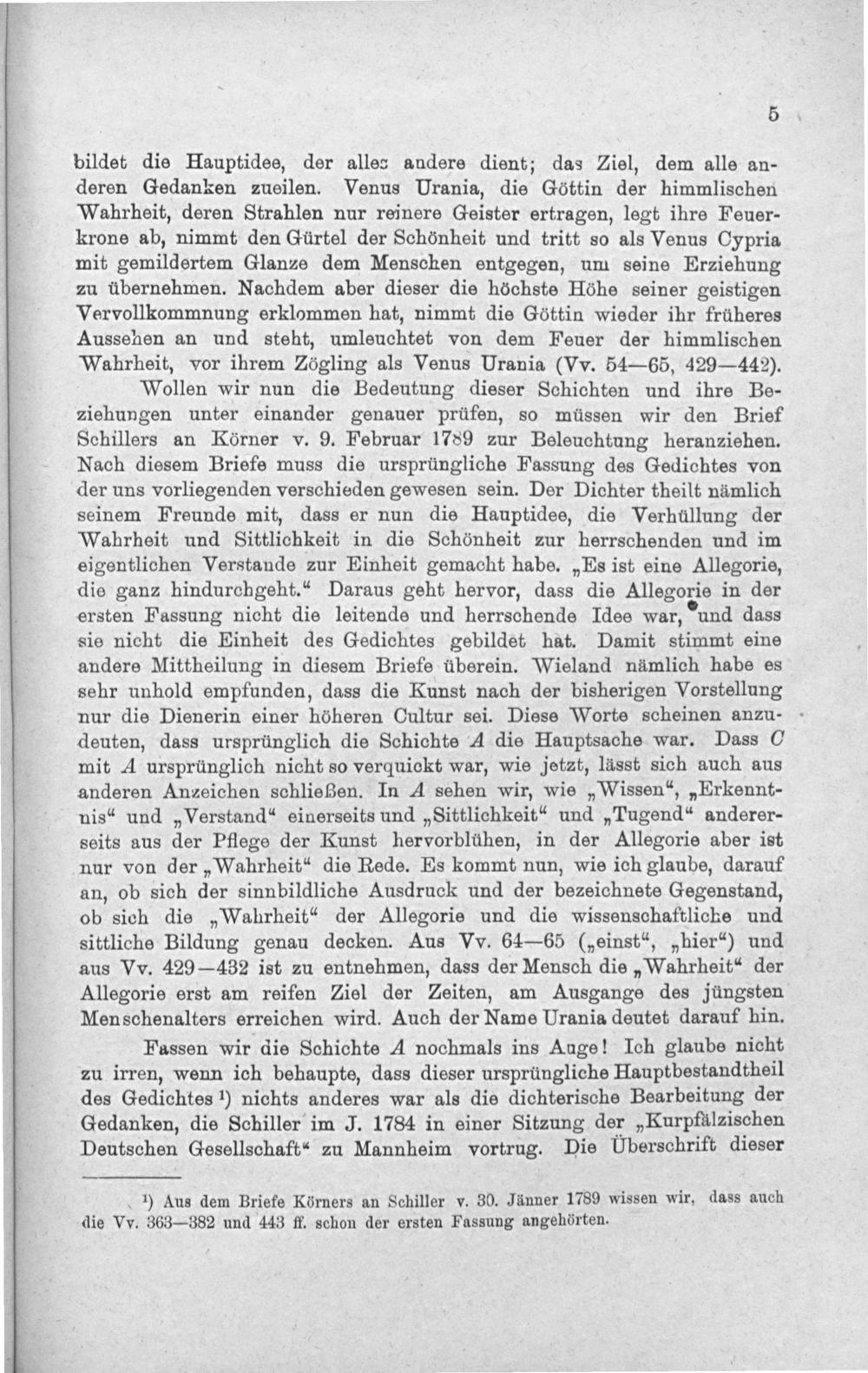 Wollen wir nun die Bedeutung dieser Schichten und ihre Be- ziehungen unter einander genauer prüfen, so müssen wir den Brief Schillers an Körner v. 9. Februar 1789 zur Beleuchtung heranziehen. Nach diesem Briefe muss die ursprüngliche Fassung des Gedichtes von der uns vorliegenden verschieden gewesen sein. Der Dichter theilt nämlich seinem Freunde mit, dass er nun die Hauptidee, die Verhüllung der Wahrheit und Sittlichkeit in die Schönheit zur herrschenden und im eigentlichen Verstande zur Einheit gemacht habe.„Es ist eine Allegorie, die ganz hindurchgeht.“ Daraus geht hervor, dass die Allegorie in der ersten Fassung nicht die leitende und herrschende Idee war, und dass sie nicht die Einheit des Gedichtes gebildet hat. Damit stimmt eine andere Mittheilung in diesem Briefe überein. Wieland nämlich habe es sehr unhold empfunden, dass die Kunst nach der bisherigen Vorstellung nur die Dienerin einer höheren Cultur sei. Diese Worte scheinen anzu- deuten, dass ursprünglich die Schichte A die Hauptsache war. Dass C mit A ursprünglich nicht so verquickt war, wie jetat, lässt sich auch aus anderen Anzeichen schließen. In A sehen wir, wie„Wissen“,„Erkennt- nis“ und„Verstand“ einerseits und„Sittlichkeit“ und„Tugend“ anderer- seits aus der Pflege der Kunst hervorblühen, in der Allegorie aber ist nur von der„Wahrheit“ die Rede. Es kommt nun, wie ich glaube, darauf an, ob sich der sinnbildliche Ausdruck und der bezeichnete Gegenstand, ob sich die„Wahrheit“ der Allegorie und die wissenschaftliche und sittliche Bildung genau decken. Aus Vv. 64— 65(„einst“,„hier“) und aus Vv. 429— 432 ist zu entnehmen, dass der Mensch die„Wahrheit“ der Allegorie erst am reifen Ziel der Zeiten, am Ausgange des jüngsten Menschenalters erreichen wird. Auch der Name Urania deutet darauf hin.