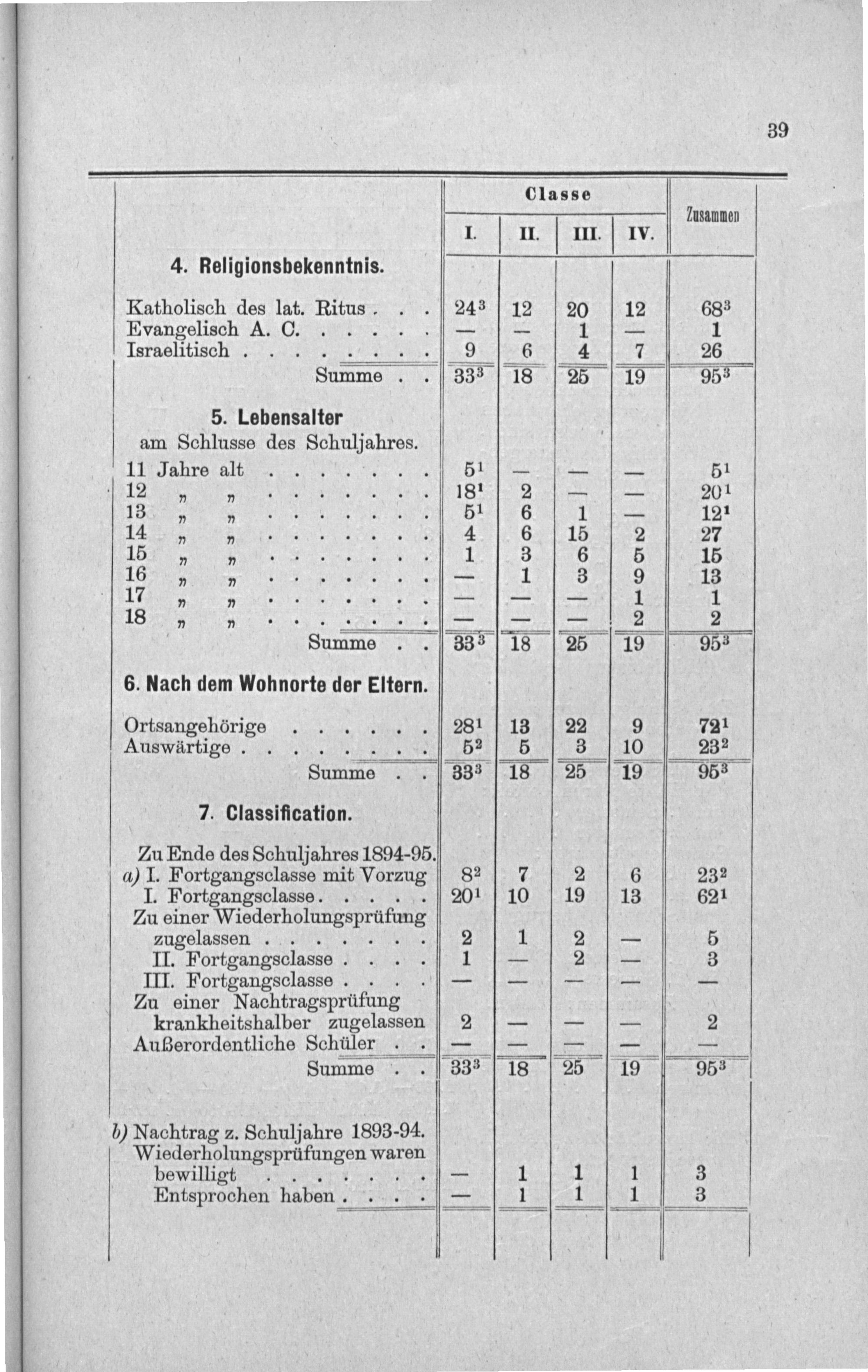 Summe 33 5 18 25 19 95³ 6. Nach dem Wohnorte der Eltern. Ortsangehörige 281 13 22 9 72¹ Auswärtige.... 52 5 3 10 23² Summe 33³3 18 25 19 95³ 7. Classification. Zu Ende des Schuljahres 1894-95. a) I. Fortgangsclasse mit Vorzug 8²2 7 2 6 23² I. Fortgangsclasse. 201 10 19 13 62¹ Zu einer Nisderholungsprufum zugelassen. 2 1 2 5 II. Fortgangsclasse. 1— 2— 3 III. Fortgangsclasse.————— Zu einer Nachtragsprüfung krankheitshalber zugelasscen 2——— 2 Außerordentliche Schüler.———— Summe 333 18 25 19 95³ 5) Nachtrag z. Schuljahre 1893-94. Wiaderholmgohrüfungen waren bewilligt..— 1 1 1 3 Entsprochen haben.— 1 1 1 3