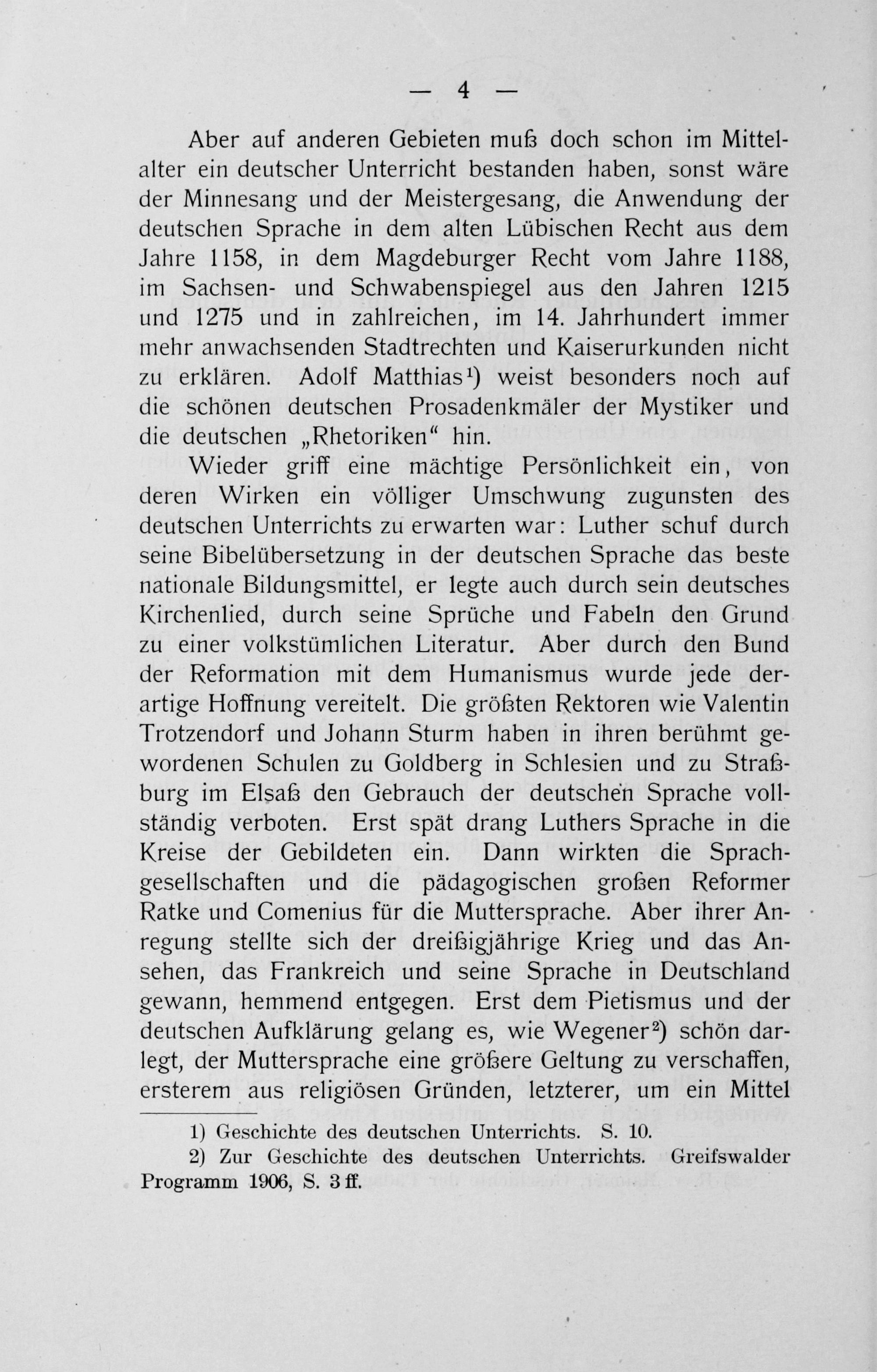 1) Geschichte des deutschen Unterrichts. S. 10. 2) Zur Geschichte des deutschen Unterrichts. Greifswalder Programm 1906, S. 3 ff.