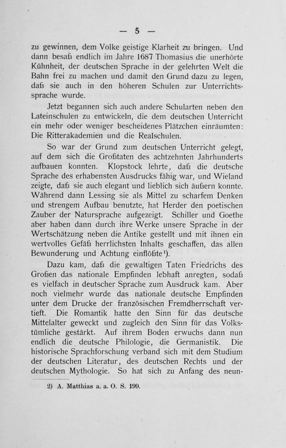 So war der Grund zum deutschen Unterricht gelegt, auf dem sich die Großtaten des achtzehnten Jahrhunderts aufbauen konnten. Klopstock lehrte, daß die deutsche Sprache des erhabensten Ausdrucks fähig war, und Wieland zeigte, daß sie auch elegant und lieblich sich äußern konnte. Während dann Lessing sie als Mittel zu scharfem Denken und strengem Aufbau benutzte, hat Herder den poetischen Zauber der Natursprache aufgezeigt. Schiller und Goethe aber haben dann durch ihre Werke unsere Sprache in der Wertschätzung neben die Antike gestellt und mit ihnen ein wertvolles Gefäß herrlichsten Inhalts geschaffen, das allen Bewunderung und Achtung einflößte¹).