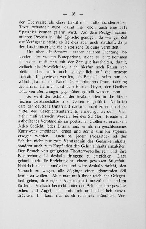 der Oberrealschule diese Lektüre in mittelhochdeutschem Texte behandelt wird, damit hier doch auch eine alte Sprache kennen gelernt wird. Auf dem Realgymnasium müssen Proben in mhd. Sprache genügen, da weniger Zeit zur Verfügung steht; es ist dies aber auch statthaft, da ja der Lateinunterricht die historische Bildung vermittelt. Um aber die Schätze unserer neueren Dichtung, be-— sonders der zweiten Blüteperiode, nicht zu kurz kommen zu lassen, muß man mit der Zeit gut haushalten, damit, vielfach als Privatlektüre, auch hierfür noch Raum ver- bleibt. Hier muß auch gelegentlich auf die neueste Literatur hingewiesen werden, als Beispiele seien nur er— wähnt„Tantris der Narr“, G. Hauptmanns Dramatisierung des armen Heinrich und sein Florian Geyer, der Goethes Gôtz von Berlichingen gegenüber gestellt werden kann. So wird der Schüler der Realanstalten in die litera- rischen Geistesschätze aller Zeiten eingeführt. Natürlich darf der deutsche Unterricht dadurch nicht zu einem Hilfs- mittel des Geschichtsunterrichts erniedrigt werden. Viel- mehr muß versucht werden, bei den Schülern Freude und ästhetisches Verständnis an poetischen Stoffen zu erwecken. Jedes Gedicht, jedes Drama muß er als ein geschlossenes Kunstwerk empfinden lernen und somit zum Kunstgenuß erzogen werden. Auch bei jedem Prosastück ist der Schüler nicht nur zum Verständnis des Gedankeninhalts, sondern auch zum Empfinden des Gefühlsinhalts anzuleiten. Der Besuch von geeigneten Theatervorstellungen und ihre Besprechung ist deshalb dringend zu empfehlen. Dazu gehört auch die Erziehung zu einem gewissen Stilgefühl. Natürlich ist es unmõglich und wäre deshalb töricht, den Versuch zu wagen, alle Zöglinge einen glänzenden Stil lehren zu wollen. Aber man mußz ihnen reichliche Gelegen- heit geben, ihre eigene Ausdrucksart auszubauen und zu fördern. Vielfach herrscht unter den Schülern eine gewisse Scheu und Angst, sich mündlich und schriftlich auszu— drücken. Ihr kann nur durch reichliche mündliche Vor-—