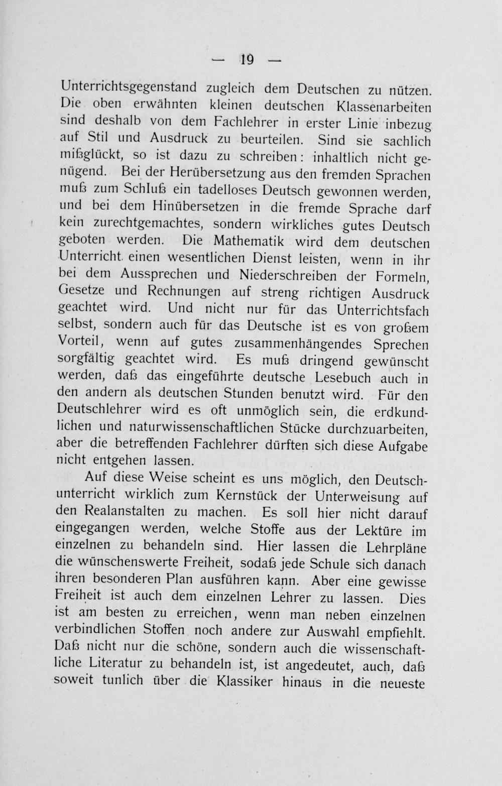 Auf diese Weise scheint es uns möglich, den Deutsch- unterricht wirklich zum Kernstück der Unterweisung auf den Realanstalten zu machen. Es soll hier nicht darauf eingegangen werden, welche Stoffe aus der Lektüre im einzelnen zu behandeln sind. Hier lassen die Lehrpläne die wünschenswerte Freiheit, sodaß jede Schule sich danach ihren besonderen Plan ausführen kann. Aber eine gewisse Freiheit ist auch dem einzelnen Lehrer zu lassen. Dies ist am besten zu erreichen, wenn man neben einzelnen verbindlichen Stoffen noch andere zur Auswahl empfiehlt. Daß nicht nur die schöne, sondern auch die wissenschaft- liche Literatur zu behandeln ist, ist angedeutet, auch, daß soweit tunlich über die Klassiker hinaus in die neueste
